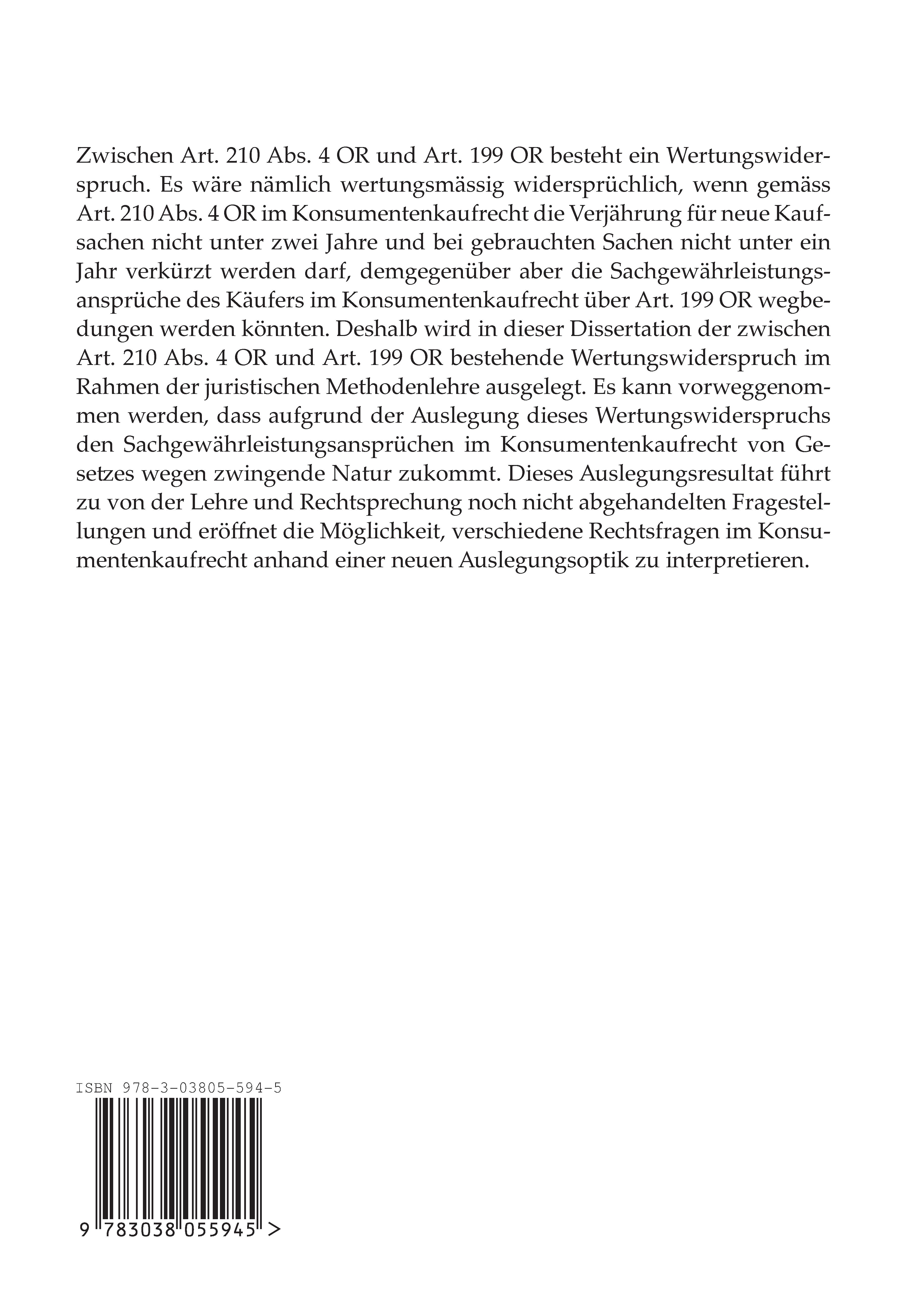 Zwischen Art. 210 Abs. 4 OR und Art. 199 OR besteht ein Wertungswiderspruch. Es wäre nämlich wertungsmässig widersprüchlich, wenn gemäss Art. 210 Abs. 4 OR im Konsumentenkaufrecht die Verjährung für neue Kaufsachen nicht unter zwei Jahre und bei gebrauchten Sachen nicht unter ein Jahr verkürzt werden darf, demgegenüber aber die Sachgewährleistungsansprüche des Käufers im Konsumentenkaufrecht über Art. 199 OR wegbedungen werden könnten. Deshalb wird in dieser Dissertation der zwischen Art. 210 Abs. 4 OR und Art. 199 OR bestehende Wertungswiderspruch im Rahmen der juristischen Methodenlehre ausgelegt. Es kann vorweggenommen werden, dass aufgrund der Auslegung dieses Wertungswiderspruchs den Sachgewährleistungsansprüchen im Konsumentenkaufrecht von Gesetzes wegen zwingende Natur zukommt. Dieses Auslegungsresultat führt zu von der Lehre und Rechtsprechung noch nicht abgehandelten Fragestellungen und eröffnet die Möglichkeit, verschiedene Rechtsfragen im Konsumentenkaufrecht anhand einer neuen Auslegungsoptik zu interpretieren.