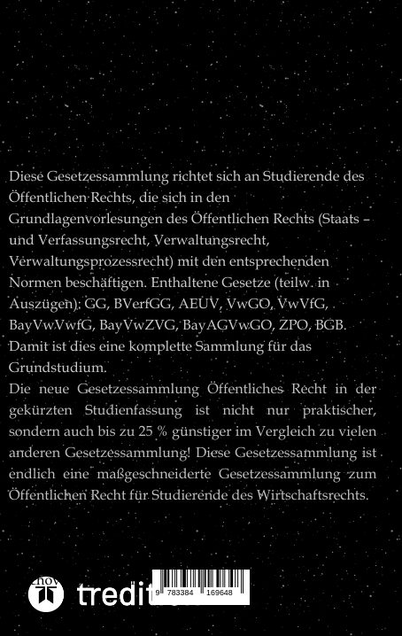 Diese Gesetzessammlung richtet sich an Studierende des Öffentlichen Rechts, die sich in den Grundlagenvorlesungen des Öffentlichen Rechts (Staats- und Verfassungsrecht, Verwaltungsrecht, Verwaltungsprozessrecht) mit den entsprechenden Normen beschäftigen. Enthaltene Gesetze (teilw. in Auszügen): GG, AEUV, VwGO, VwVfG, BayVwVfG, BayVwZVG, BayAGVwGO, ZPO, BGB. Damit ist dies eine komplette Sammlung für das Grundstudium. Die neue Gesetzessammlung Öffentliches Recht in der gekürzten Studienfassung ist nicht nur praktischer, sondern auch bis zu 25% günstiger im Vergleich zu vielen anderen Gesetzessammlungen! Diese Gesetzessammlung ist endlich eine massgeschneiderte Gesetzessammlung zum Öffentlichen Recht für Studierende des Wirtschaftsrechts. Ein individueller Begleiter auf dem Weg zum erfolgreichen Studium! Beinhaltet neben einer ausführlichen Einführung von Prof. Dr. iur Martin Wachovius auch ein umfangreiches Stichwortverzeichnis.