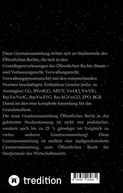 Diese Gesetzessammlung richtet sich an Studierende des Öffentlichen Rechts, die sich in den Grundlagenvorlesungen des Öffentlichen Rechts (Staats- und Verfassungsrecht, Verwaltungsrecht, Verwaltungsprozessrecht) mit den entsprechenden Normen beschäftigen. Enthaltene Gesetze (teilw. in Auszügen): GG, AEUV, VwGO, VwVfG, BayVwVfG, BayVwZVG, BayAGVwGO, ZPO, BGB. Damit ist dies eine komplette Sammlung für das Grundstudium. Die neue Gesetzessammlung Öffentliches Recht in der gekürzten Studienfassung ist nicht nur praktischer, sondern auch bis zu 25% günstiger im Vergleich zu vielen anderen Gesetzessammlungen! Diese Gesetzessammlung ist endlich eine massgeschneiderte Gesetzessammlung zum Öffentlichen Recht für Studierende des Wirtschaftsrechts. Ein individueller Begleiter auf dem Weg zum erfolgreichen Studium! Beinhaltet neben einer ausführlichen Einführung von Prof. Dr. iur Martin Wachovius auch ein umfangreiches Stichwortverzeichnis.