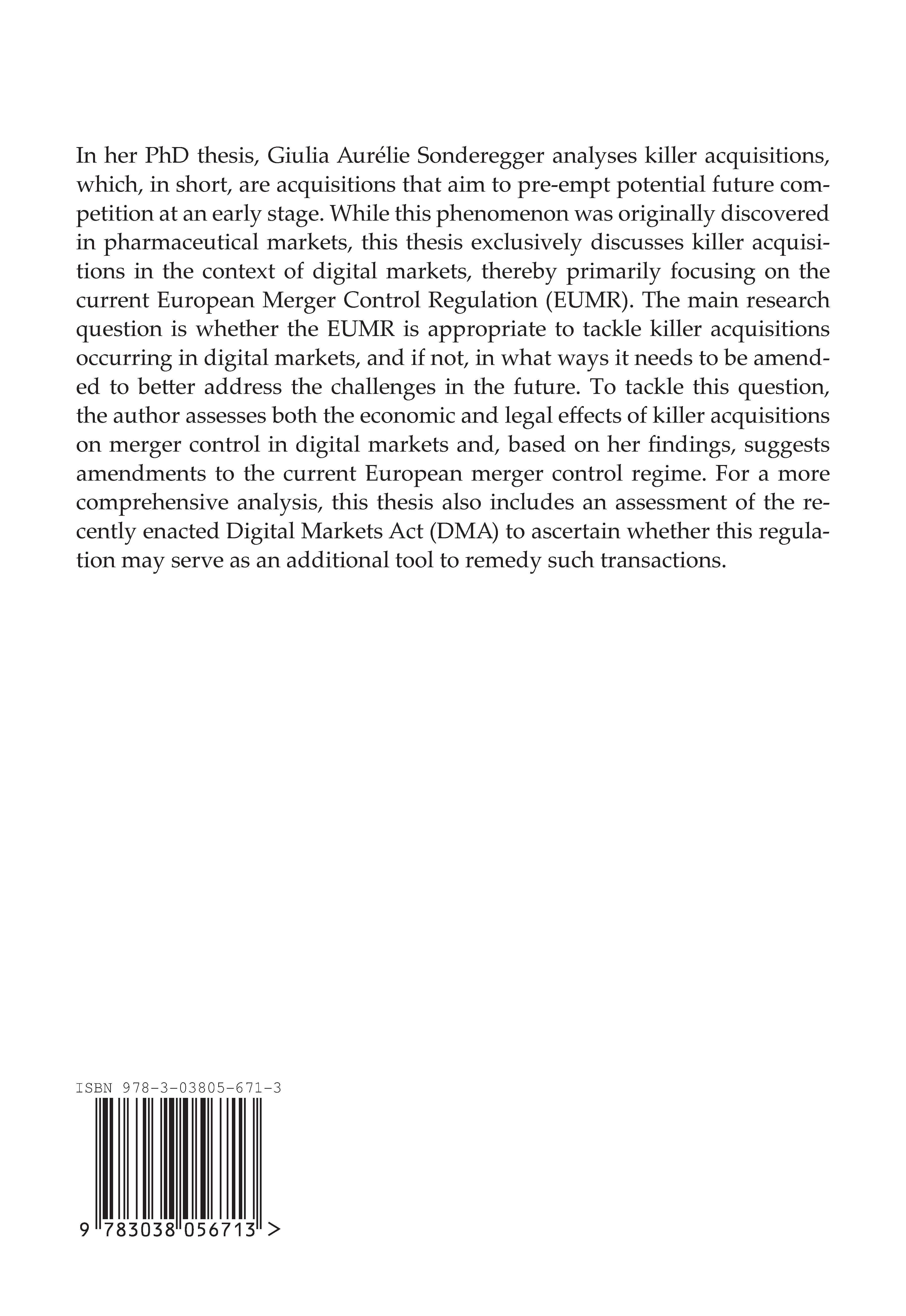 In her PhD thesis, Giulia Aurélie Sonderegger analyses killer acquisitions, which, in short, are acquisitions that aim to pre-empt potential future competition at an early stage. While this phenomenon was originally discovered in pharmaceutical markets, this thesis exclusively discusses killer acquisitions in the context of digital markets, thereby primarily focusing on the current European Merger Control Regulation (EUMR). The main research question is whether the EUMR is appropriate to tackle killer acquisitions occurring in digital markets, and if not, in what ways it needs to be amended to better address the challenges in the future. To tackle this question, the author assesses both the economic and legal effects of killer acquisitions on merger control in digital markets and, based on her findings, suggests amendments to the current European merger control regime. For a more comprehensive analysis, this thesis also includes an assessment of the recently enacted Digital Markets Act (DMA) to ascertain whether this regulation may serve as an additional tool to remedy such transactions.