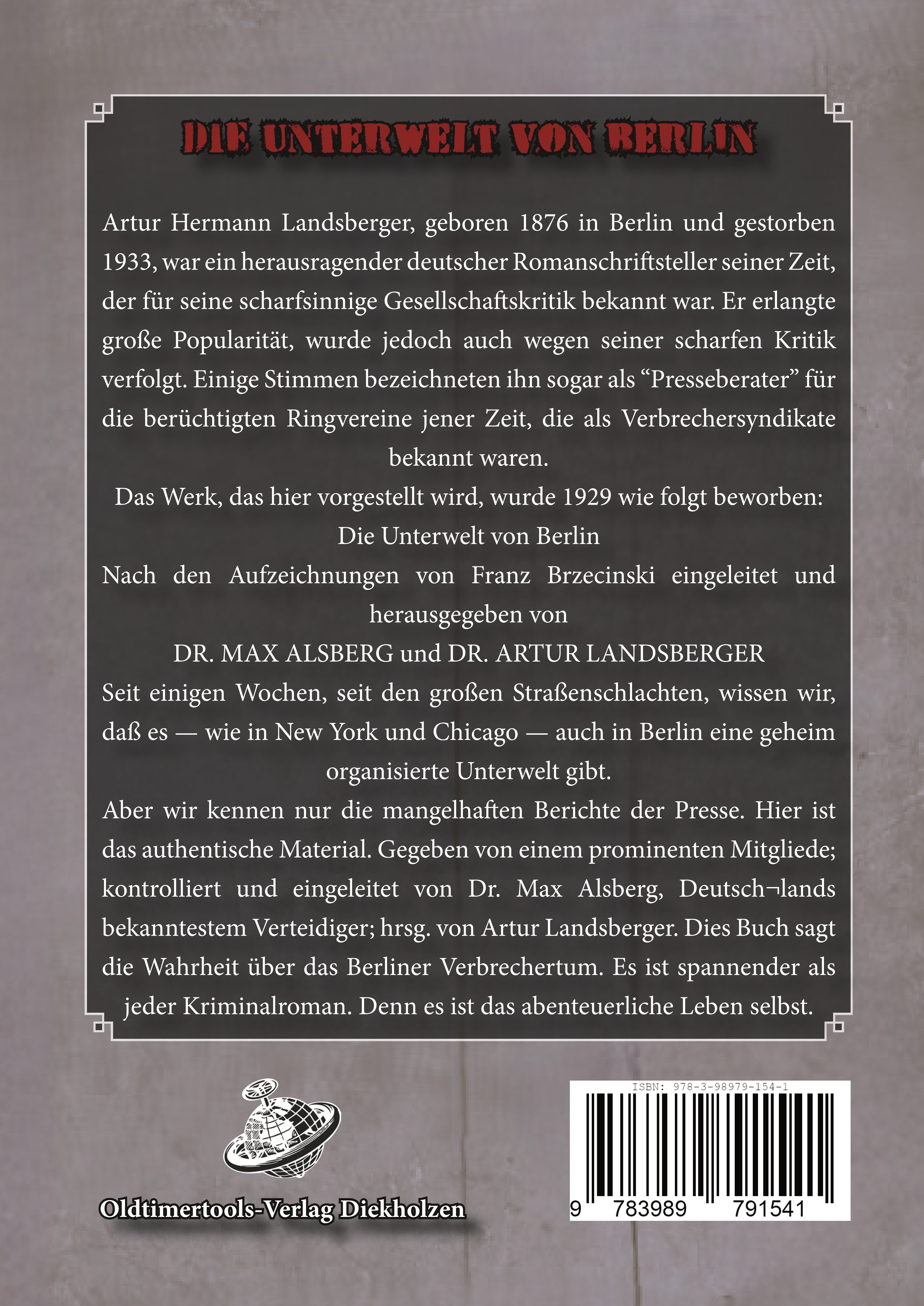 DIE Unterwelt von BerlinArtur Hermann Landsberger, geboren 1876 in Berlin und gestorben1933, war ein herausragender deutscher Romanschriftsteller seiner Zeit,der für seine scharfsinnige Gesellschaftskritik bekannt war. Er erlangtegroße Popularität, wurde jedoch auch wegen seiner scharfen Kritikverfolgt. Einige Stimmen bezeichneten ihn sogar als "Presseberater" fürdie berüchtigten Ringvereine jener Zeit, die als Verbrechersyndikatebekannt waren.Das Werk, das hier vorgestellt wird, wurde 1929 wie folgt beworben:Die Unterwelt von BerlinNach den Aufzeichnungen von Franz Brzecinski eingeleitet undherausgegeben vonDR. MAX ALSBERG und DR. ARTUR LANDSBERGERSeit einigen Wochen, seit den großen Straßenschlachten, wissen wir,daß es - wie in New York und Chicago - auch in Berlin eine geheimorganisierte Unterwelt gibt.Aber wir kennen nur die mangelhaften Berichte der Presse. Hier istdas authentische Material. Gegeben von einem prominenten Mitgliede;kontrolliert und eingeleitet von Dr. Max Alsberg, Deutschlandsbekanntestem Verteidiger; hrsg. von Artur Landsberger. Dies Buch sagtdie Wahrheit über das Berliner Verbrechertum. Es ist spannender alsjeder Kriminalroman. Denn es ist das abenteuerliche Leben selbst.