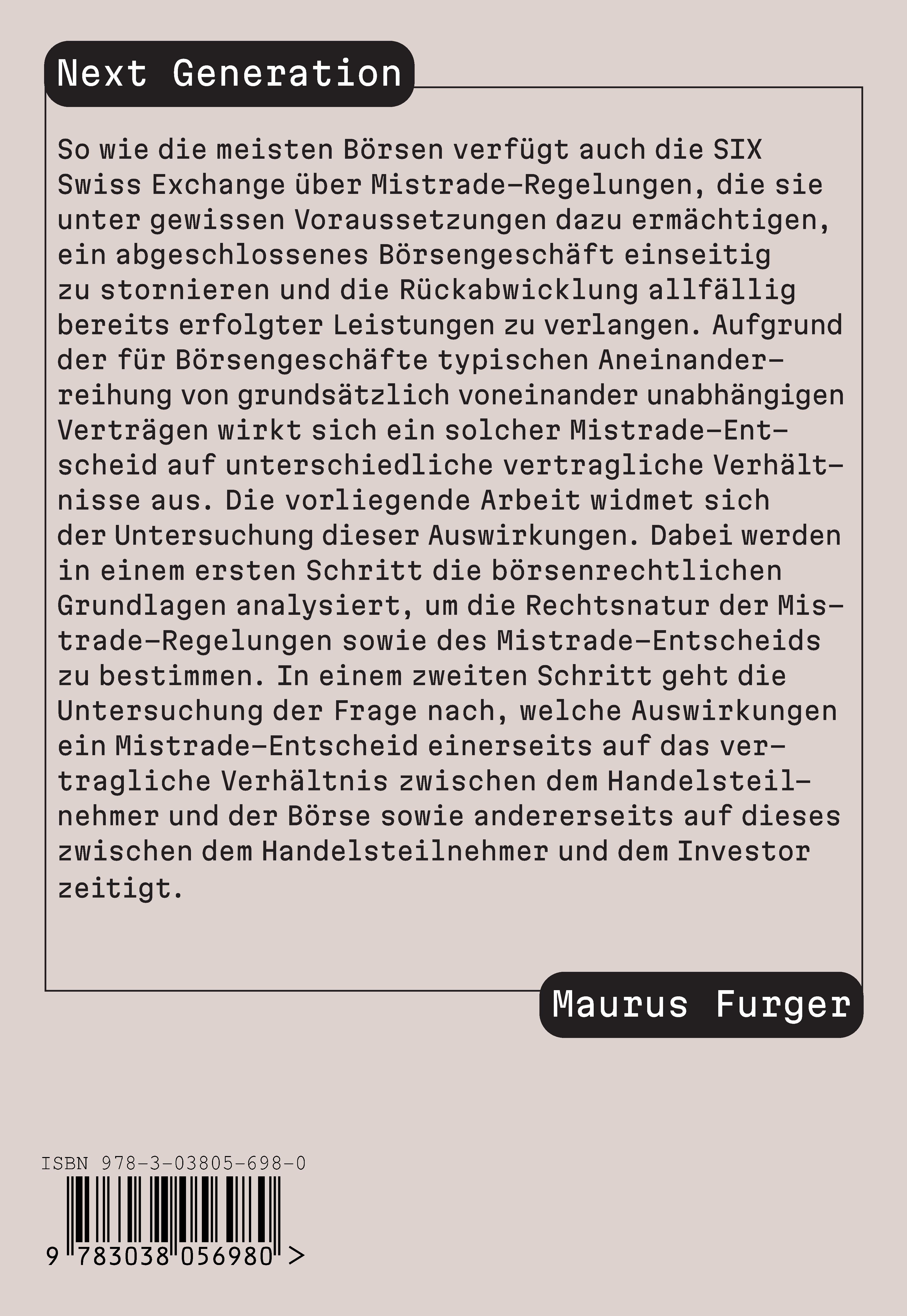 So wie die meisten Borsen verfügt auch die SIX Swiss Exchange über Mistrade-Regelungen, die sie unter gewissen Voraussetzungen dazu ermachtigen, ein abgeschlossenes Borsengeschaft einseitig zu stornieren und die Rückabwicklung allfallig bereits erfolgter Leistungen zu verlangen. Aufgrund der für Borsengeschafte typischen Aneinanderreihung von grundsatzlich voneinander unabhangigen Vertragen wirkt sich ein solcher Mistrade-Entscheid auf unterschiedliche vertragliche Verhaltnisse aus. Die vorliegende Arbeit widmet sich der Untersuchung dieser Auswirkungen. Dabei werden in einem ersten Schritt die borsenrechtlichen Grundlagen analysiert, um die Rechtsnatur der Mistrade-Regelungen sowie des Mistrade-Entscheids zu bestimmen. In einem zweiten Schritt geht die Untersuchung der Frage nach, welche Auswirkungen ein Mistrade-Entscheid einerseits auf das vertragliche Verhaltnis zwischen dem Handelsteilnehmer und der Borse sowie andererseits auf dieses zwischen dem Handelsteilnehmer und dem Investor zeitigt.