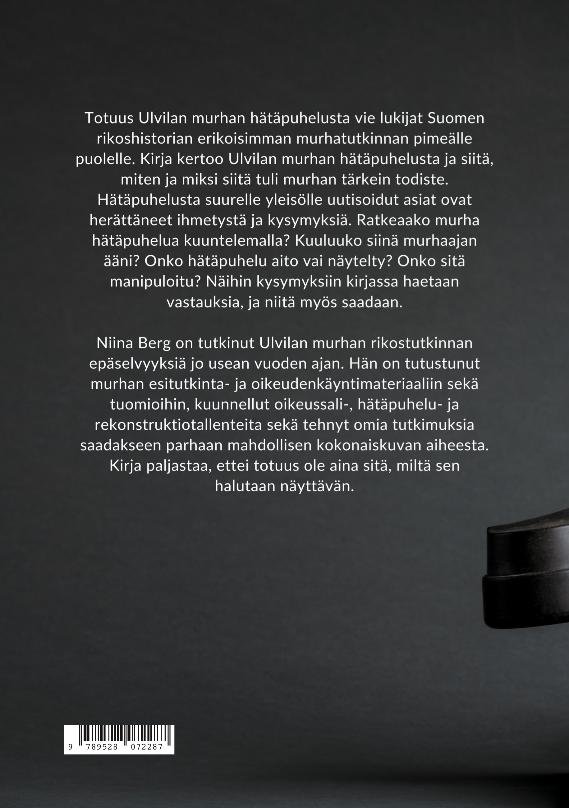 Totuus Ulvilan murhan hätäpuhelusta vie lukijat Suomen rikoshistorian erikoisimman murhatutkinnan pimeälle puolelle. Kirja kertoo Ulvilan murhan hätäpuhelusta ja siitä, miten ja miksi siitä tuli murhan tärkein todiste. Hätäpuhelusta suurelle yleisölle uutisoidut asiat ovat herättäneet ihmetystä ja kysymyksiä. Ratkeaako murha hätäpuhelua kuuntelemalla? Kuuluuko siinä murhaajan ääni? Onko hätäpuhelu aito vai näytelty? Onko sitä manipuloitu? Näihin kysymyksiin kirjassa haetaan vastauksia, ja niitä myös saadaan.