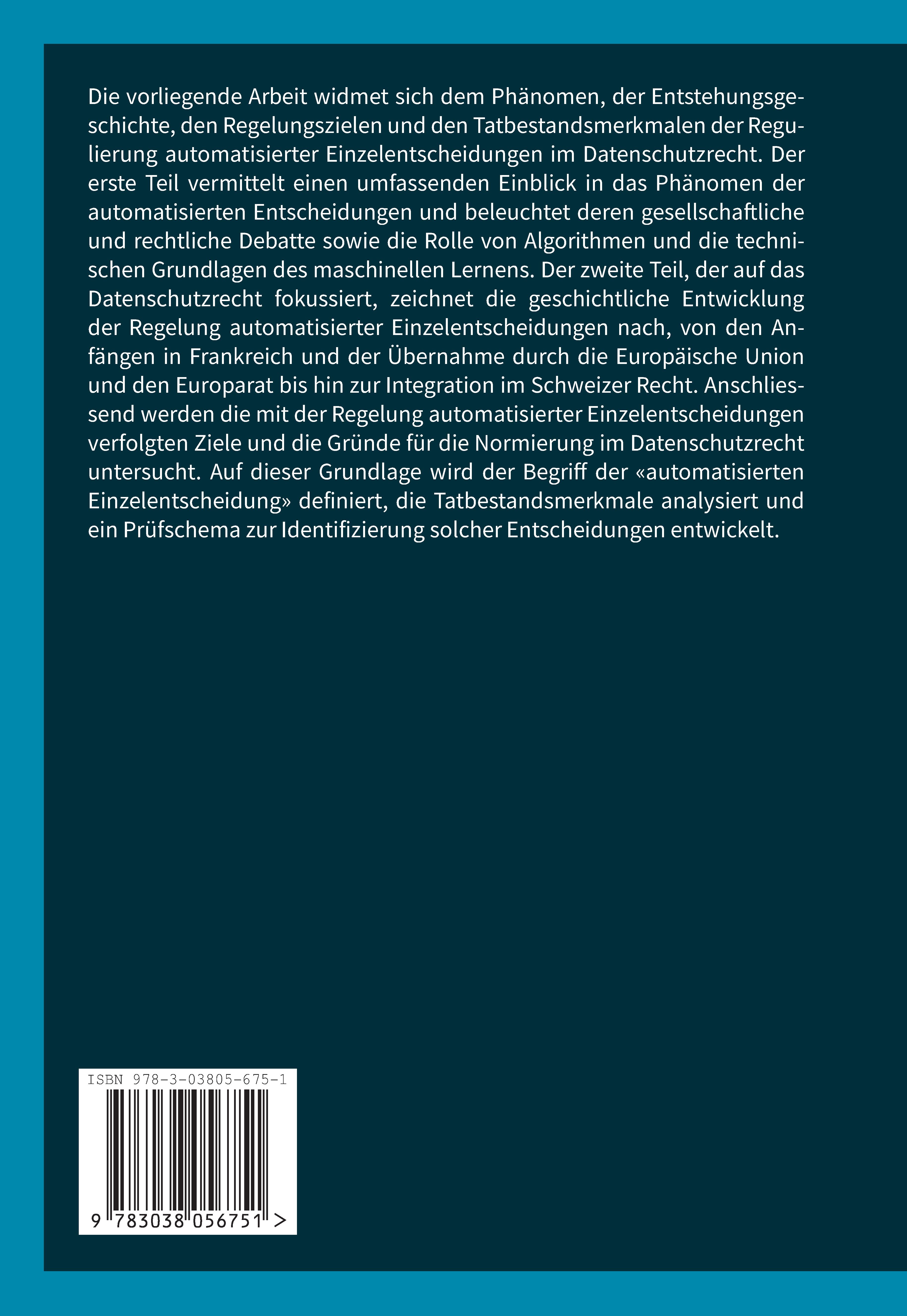 Die vorliegende Arbeit widmet sich dem Phänomen, der Entstehungsgeschichte, den Regelungszielen und den Tatbestandsmerkmalen der Regulierung automatisierter Einzelentscheidungen im Datenschutzrecht. Der erste Teil vermittelt einen umfassenden Einblick in das Phänomen der automatisierten Entscheidungen und beleuchtet deren gesellschaftliche und rechtliche Debatte sowie die Rolle von Algorithmen und die technischen Grundlagen des maschinellen Lernens. Der zweite Teil, der auf das Datenschutzrecht fokussiert, zeichnet die geschichtliche Entwicklung der Regelung automatisierter Einzelentscheidungen nach, von den Anfängen in Frankreich und der Übernahme durch die Europäische Union und den Europarat bis hin zur Integration im Schweizer Recht. Anschliessend werden die mit der Regelung automatisierter Einzelentscheidungen verfolgten Ziele und die Gründe für die Normierung im Datenschutzrecht untersucht. Auf dieser Grundlage wird der Begriff der «automatisierten Einzelentscheidung» definiert, die Tatbestandsmerkmale analysiert und ein Prüfschema zur Identifizierung solcher Entscheidungen entwickelt.