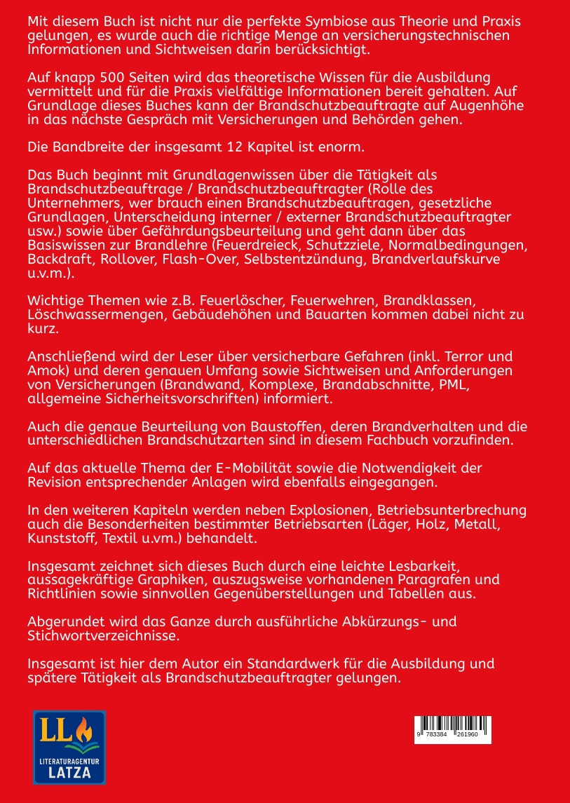Mit diesem Buch ist nicht nur die perfekte Symbiose aus Theorie und Praxis gelungen, es wurde auch die richtige Menge an versicherungstechnischen Informationen und Sichtweisen darin berücksichtigt. Auf knapp 500 Seiten wird das theoretische Wissen für die Ausbildung vermittelt und für die Praxis vielfältige Informationen bereit gehalten. Auf Grundlage dieses Buches kann der Brandschutzbeauftragte auf Augenhöhe in das nächste Gespräch mit Versicherungen und Behörden gehen.Die Bandbreite der insgesamt 12 Kapitel ist enorm. Das Buch beginnt mit Grundlagenwissen über die Tätigkeit als Brandschutzbeauftrage / Brandschutzbeauftragter (Rolle des Unternehmers, wer brauch einen Brandschutzbeauftragen, gesetzliche Grundlagen, Unterscheidung interner / externer Brandschutzbeauftragter usw.) sowie über Gefährdungsbeurteilung und geht dann über das Basiswissen zur Brandlehre (Feuerdreieck, Schutzziele, Normalbedingungen, Backdraft, Rollover, Flash-Over, Selbstentzündung, Brandverlaufskurve u.v.m.).Wichtige Themen wie z.B. Feuerlöscher, Feuerwehren, Brandklassen, Löschwassermengen, Gebäudehöhen und Bauarten kommen dabei nicht zu kurz.Anschließend wird der Leser über versicherbare Gefahren (inkl. Terror und Amok) und deren genauen Umfang sowie Sichtweisen und Anforderungen von Versicherungen (Brandwand, Komplexe, Brandabschnitte, PML, allgemeine Sicherheitsvorschriften) informiert.Auch die genaue Beurteilung von Baustoffen, deren Brandverhalten und die unterschiedlichen Brandschutzarten sind in diesem Fachbuch vorzufinden.Auf das aktuelle Thema der E-Mobilität sowie die Notwendigkeit der Revision entsprechender Anlagen wird ebenfalls eingegangen. In den weiteren Kapiteln werden neben Explosionen, Betriebsunterbrechung auch die Besonderheiten bestimmter Betriebsarten (Läger, Holz, Metall, Kunststoff, Textil u.vm.) behandelt.Insgesamt zeichnet sich dieses Buch durch eine leichte Lesbarkeit, aussagekräftige Graphiken, auszugsweise vorhandenen Paragrafen und Richtlinien sowie sinnvollen Gegenüberstellungen und Tabellen aus. Abgerundet wird das Ganze durch ausführliche Abkürzungs- und Stichwortverzeichnisse.Insgesamt ist hier dem Autor ein Standardwerk für die Ausbildung und spätere Tätigkeit als Brandschutzbeauftragter gelungen.