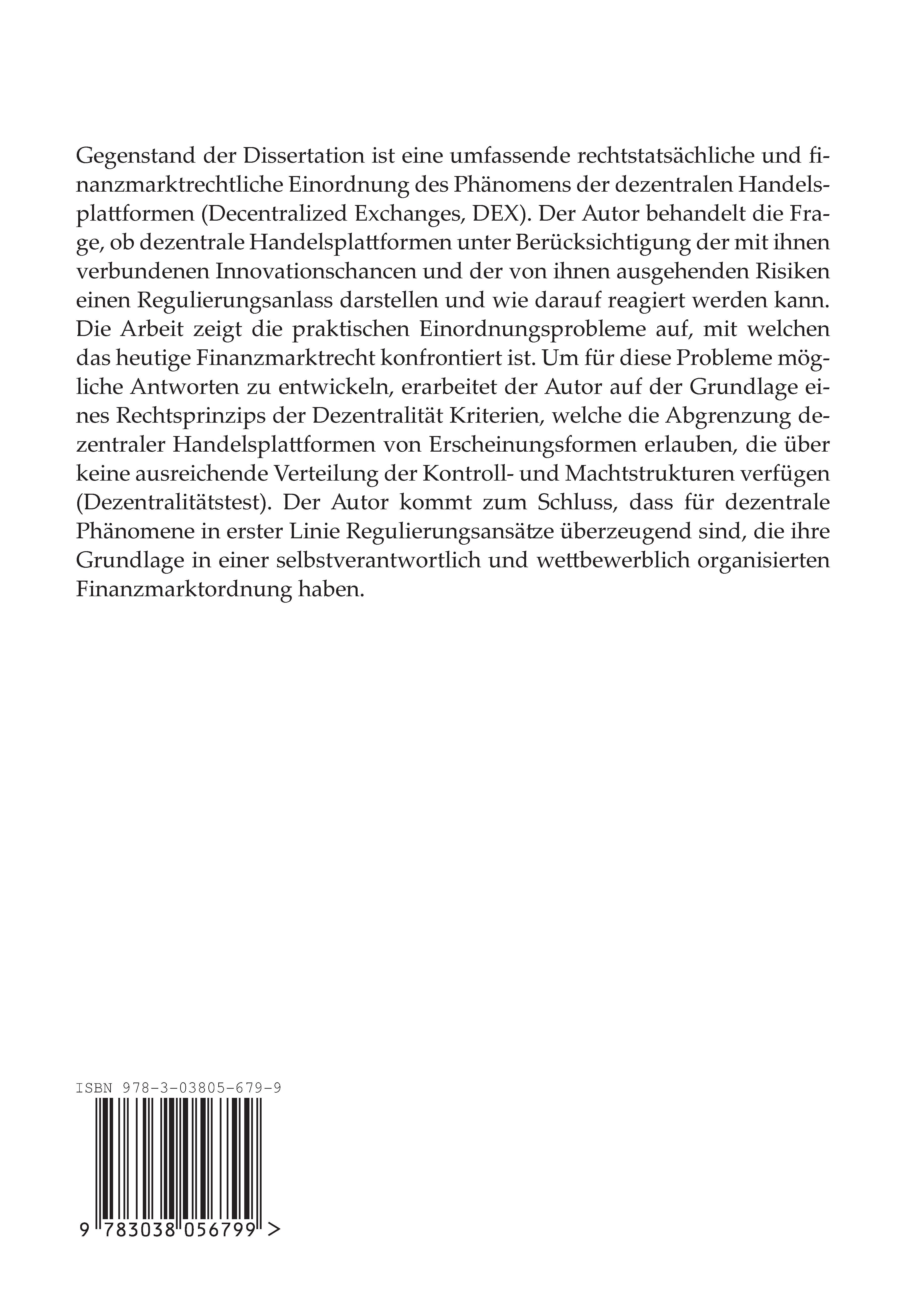 Gegenstand der Dissertation ist eine umfassende rechtstatsächliche und finanzmarktrechtliche Einordnung des Phänomens der dezentralen Handelsplattformen (Decentralized Exchanges, DEX). Der Autor behandelt die Frage, ob dezentrale Handelsplattformen unter Berücksichtigung der mit ihnen verbundenen Innovationschancen und der von ihnen ausgehenden Risiken einen Regulierungsanlass darstellen und wie darauf reagiert werden kann. Die Arbeit zeigt die praktischen Einordnungsprobleme auf, mit welchen das heutige Finanzmarktrecht konfrontiert ist. Um für diese Probleme mögliche Antworten zu entwickeln, erarbeitet der Autor auf der Grundlage eines Rechtsprinzips der Dezentralität Kriterien, welche die Abgrenzung dezentraler Handelsplattformen von Erscheinungsformen erlauben, die über keine ausreichende Verteilung der Kontroll- und Machtstrukturen verfügen (Dezentralitätstest). Der Autor kommt zum Schluss, dass für dezentrale Phänomene in erster Linie Regulierungsansätze überzeugend sind, die ihre Grundlage in einer selbstverantwortlich und wettbewerblich organisierten Finanzmarktordnung haben.