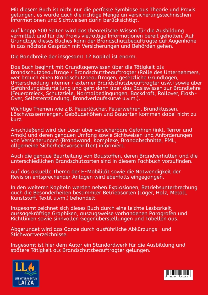 Mit diesem Buch ist nicht nur die perfekte Symbiose aus Theorie und Praxis gelungen, es wurde auch die richtige Menge an versicherungstechnischen Informationen und Sichtweisen darin berücksichtigt. Auf knapp 500 Seiten wird das theoretische Wissen für die Ausbildung vermittelt und für die Praxis vielfältige Informationen bereit gehalten. Auf Grundlage dieses Buches kann der Brandschutzbeauftragte auf Augenhöhe in das nächste Gespräch mit Versicherungen und Behörden gehen.Die Bandbreite der insgesamt 12 Kapitel ist enorm. Das Buch beginnt mit Grundlagenwissen über die Tätigkeit als Brandschutzbeauftrage / Brandschutzbeauftragter (Rolle des Unternehmers, wer brauch einen Brandschutzbeauftragen, gesetzliche Grundlagen, Unterscheidung interner / externer Brandschutzbeauftragter usw.) sowie über Gefährdungsbeurteilung und geht dann über das Basiswissen zur Brandlehre (Feuerdreieck, Schutzziele, Normalbedingungen, Backdraft, Rollover, Flash-Over, Selbstentzündung, Brandverlaufskurve u.v.m.).Wichtige Themen wie z.B. Feuerlöscher, Feuerwehren, Brandklassen, Löschwassermengen, Gebäudehöhen und Bauarten kommen dabei nicht zu kurz.Anschließend wird der Leser über versicherbare Gefahren (inkl. Terror und Amok) und deren genauen Umfang sowie Sichtweisen und Anforderungen von Versicherungen (Brandwand, Komplexe, Brandabschnitte, PML, allgemeine Sicherheitsvorschriften) informiert.Auch die genaue Beurteilung von Baustoffen, deren Brandverhalten und die unterschiedlichen Brandschutzarten sind in diesem Fachbuch vorzufinden.Auf das aktuelle Thema der E-Mobilität sowie die Notwendigkeit der Revision entsprechender Anlagen wird ebenfalls eingegangen. In den weiteren Kapiteln werden neben Explosionen, Betriebsunterbrechung auch die Besonderheiten bestimmter Betriebsarten (Läger, Holz, Metall, Kunststoff, Textil u.vm.) behandelt.Insgesamt zeichnet sich dieses Buch durch eine leichte Lesbarkeit, aussagekräftige Graphiken, auszugsweise vorhandenen Paragrafen und Richtlinien sowie sinnvollen Gegenüberstellungen und Tabellen aus. Abgerundet wird das Ganze durch ausführliche Abkürzungs- und Stichwortverzeichnisse.Insgesamt ist hier dem Autor ein Standardwerk für die Ausbildung und spätere Tätigkeit als Brandschutzbeauftragter gelungen.