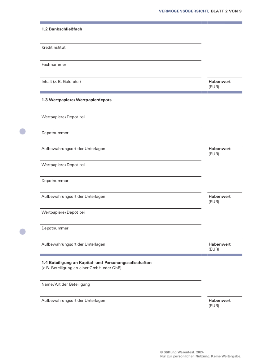 Arbeiten Sie mit Formularen und Ausfüllhilfen! Dieses Buch enthält Formulare für Ihre Vermögensübersicht, eine Übersicht über die Online-Konten, sowie Ihre persönliche Bestattungsverfügung. Alle Dokumente können Sie heraustrennen und herunterladen, um Ihre Arbeit so einfach wie möglich zu gestalten.