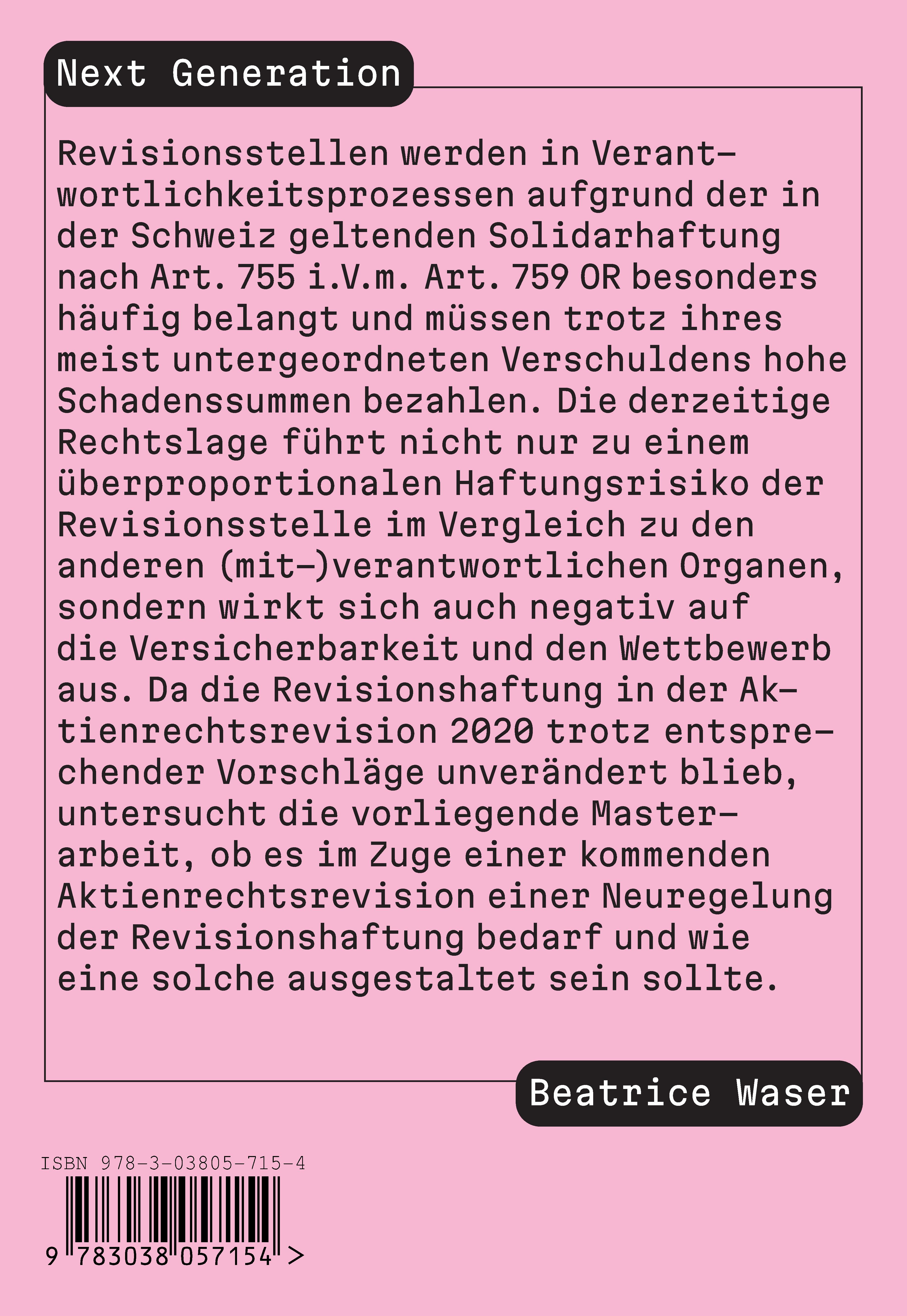 Revisionsstellen werden in Verantwortlichkeitsprozessen aufgrund der in der Schweiz geltenden Solidarhaftung nach Art. 755 i.V.m. Art. 759 OR besonders häufig belangt und müssen trotz ihres meist untergeordneten Verschuldens hohe Schadenssummen bezahlen. Die derzeitige Rechtslage führt nicht nur zu einem überproportionalen Haftungsrisiko der Revisionsstelle im Vergleich zu den anderen (mit-)verantwortlichen Organen, sondern wirkt sich auch negativ auf die Versicherbarkeit und den Wettbewerb aus. Da die Revisionshaftung in der Aktienrechtsrevision 2020 trotz entsprechender Vorschläge unverändert blieb, untersucht die vorliegende Masterarbeit, ob es im Zuge einer kommenden Aktienrechtsrevision einer Neuregelung der Revisionshaftung bedarf und wie eine solche ausgestaltet sein sollte.