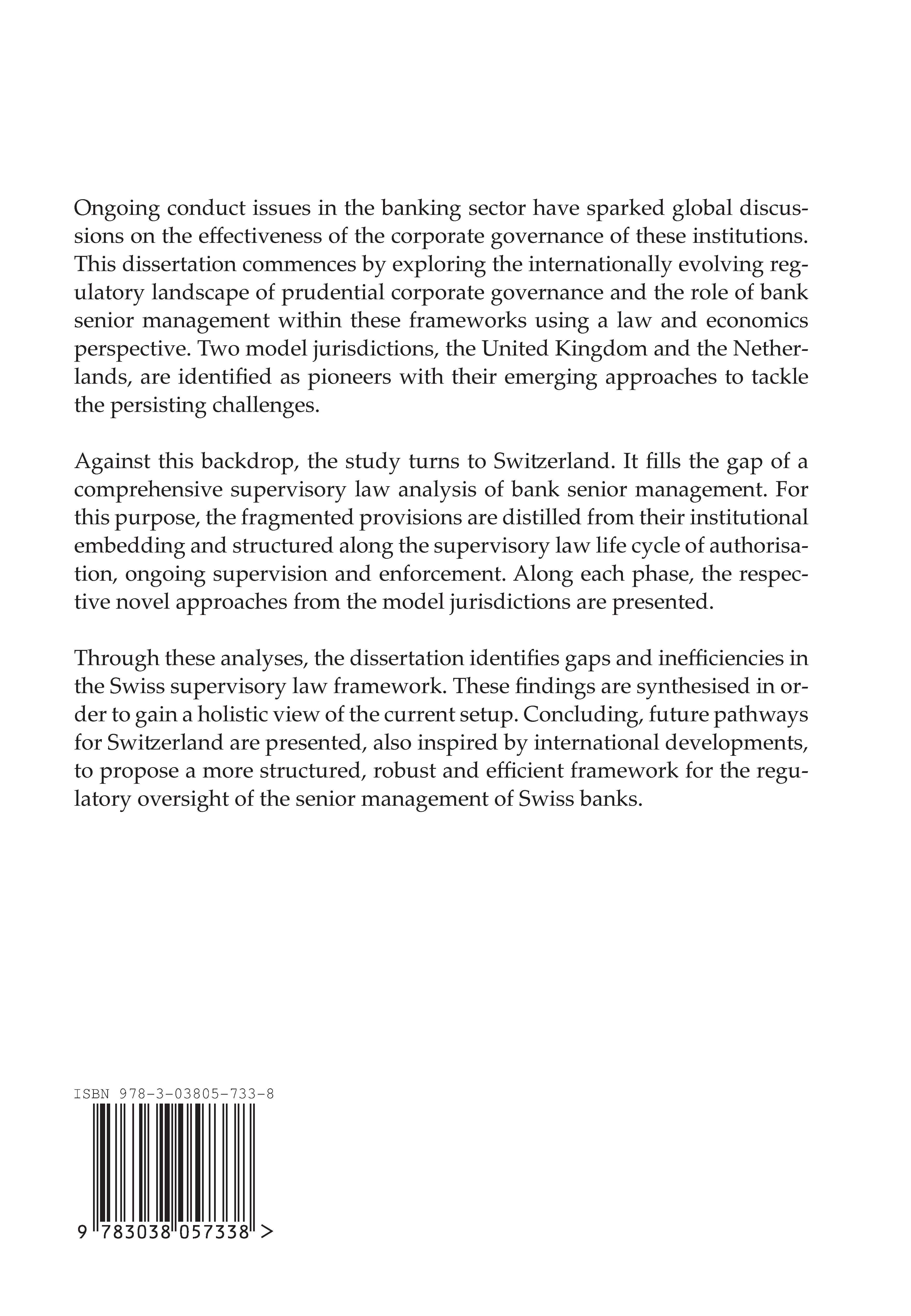 Ongoing conduct issues in the banking sector have sparked global discussions on the effectiveness of the corporate governance of these institutions. This dissertation commences by exploring the internationally evolving regulatory landscape of prudential corporate governance and the role of bank senior management within these frameworks using a law and economics perspective. Two model jurisdictions, the United Kingdom and the Netherlands, are identified as pioneers with their emerging approaches to tackle the persisting challenges.Against this backdrop, the study turns to Switzerland. It fills the gap of a comprehensive supervisory law analysis of bank senior management. For this purpose, the fragmented provisions are distilled from their institutional embedding and structured along the supervisory law life cycle of authorisation, ongoing supervision and enforcement. Along each phase, the respective novel approaches from the model jurisdictions are presented.Through these analyses, the dissertation identifies gaps and inefficiencies in the Swiss supervisory law framework. These findings are synthesised in order to gain a holistic view of the current setup. Concluding, future pathways for Switzerland are presented, also inspired by international developments, to propose a more structured, robust and efficient framework for the regulatory oversight of the senior management of Swiss banks.