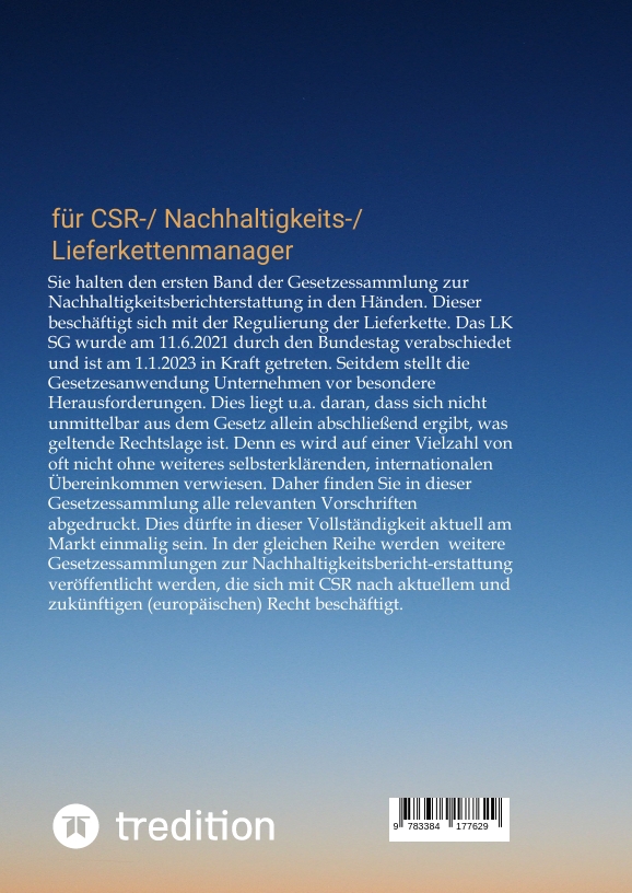 Nachhaltigkeitsberichterstattung erlangt für Unternehmen eine immer größere Bedeutung. So müssen immer mehr Unternehmen u.a. berichten, wie sie entlang der Lieferkette Menschenrechte und Umweltschutz beachten. Die vorliegende Sammlung enthält alle für das LkSG (Lieferkettensorgfaltspflichtengesetz) relevanten Vorschriften (u.a. ILO Kernarbeitsnormen, UN-Zivilpakt, Sozialpakt UN, Minamata-Übereinkommen, Stockholmer Übereinkommen/ POPs-Übereinkommen, Basler-Übereinkommen, AbfVerbrVO (EG) 1013/2006, Waldschutz-VO (EU) 2023/1115, HolzSiG, KonflMinVO (EU) 2017/821, MinRohSorgG) und stellt damit die aktuellste Sammlung auf dem deutschen Markt dar.