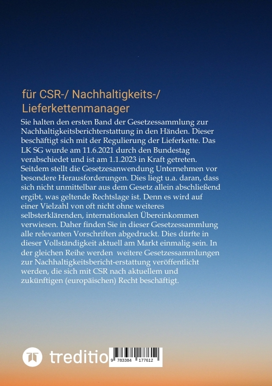 Nachhaltigkeitsberichterstattung erlangt für Unternehmen eine immer größere Bedeutung. So müssen immer mehr Unternehmen u.a. berichten, wie sie entlang der Lieferkette Menschenrechte und Umweltschutz beachten. Die vorliegende Sammlung enthält alle für das LkSG (Lieferkettensorgfaltspflichtengesetz) relevanten Vorschriften (u.a. ILO Kernarbeitsnormen, UN-Zivilpakt, Sozialpakt UN, Minamata-Übereinkommen, Stockholmer Übereinkommen/ POPs-Übereinkommen, Basler-Übereinkommen, AbfVerbrVO (EG) 1013/2006, Waldschutz-VO (EU) 2023/1115, HolzSiG, KonflMinVO (EU) 2017/821, MinRohSorgG) und stellt damit die aktuellste Sammlung auf dem deutschen Markt dar.