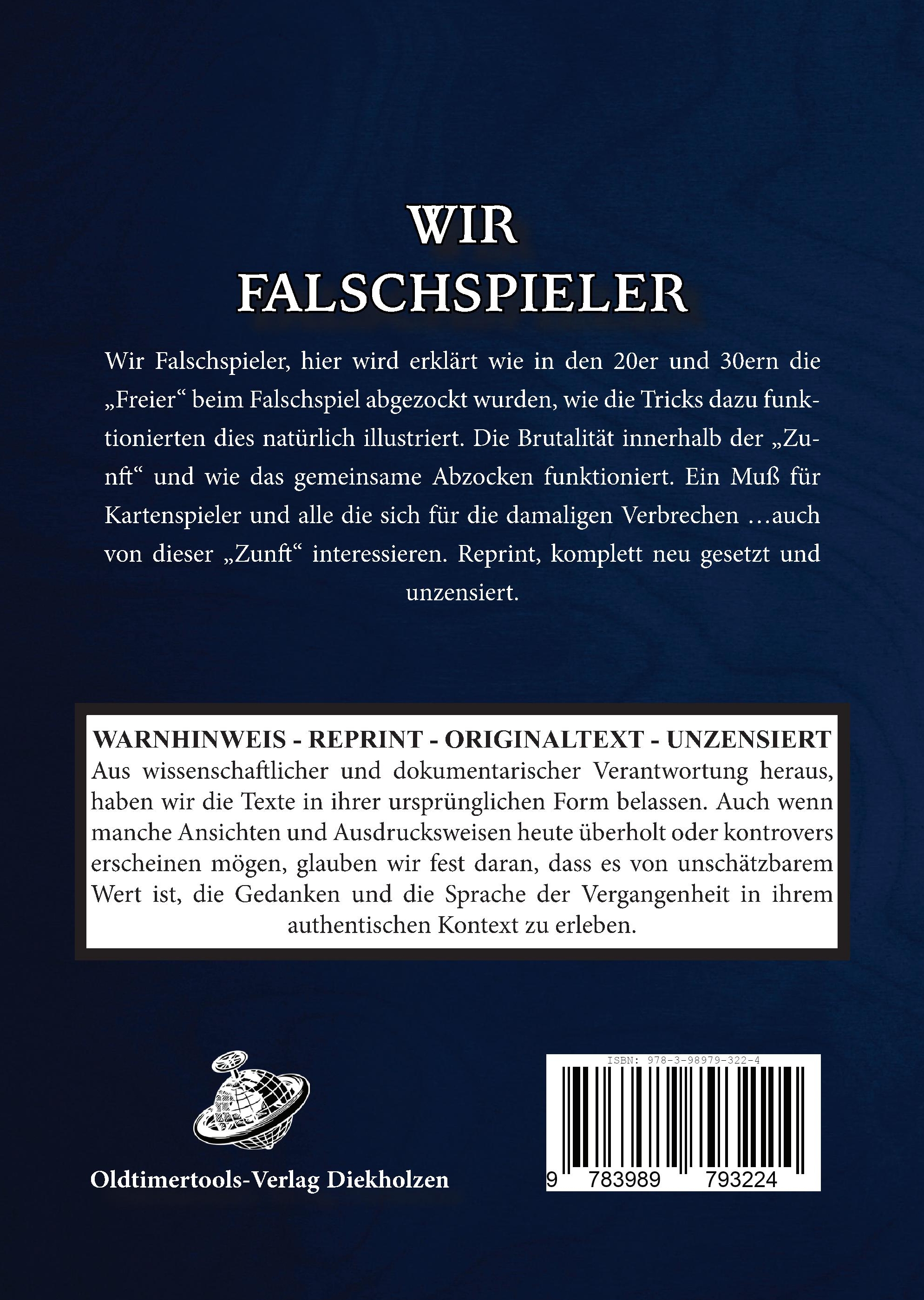Wir Falschspieler, hier wird erklärt wie in den 20er und 30ern die "Freier" beim Falschspiel abgezockt wurden, wie die Tricks dazu funktionierten dies natürlich illustriert. Die Brutalität innerhalb der "Zunft" und wie das gemeinsame Abzocken funktioniert. Ein Muss für Kartenspieler und alle die sich für die damaligen Verbrechen ...auch von dieser "Zunft" interessieren. Reprint, komplett neu gesetzt und unzensiert.
