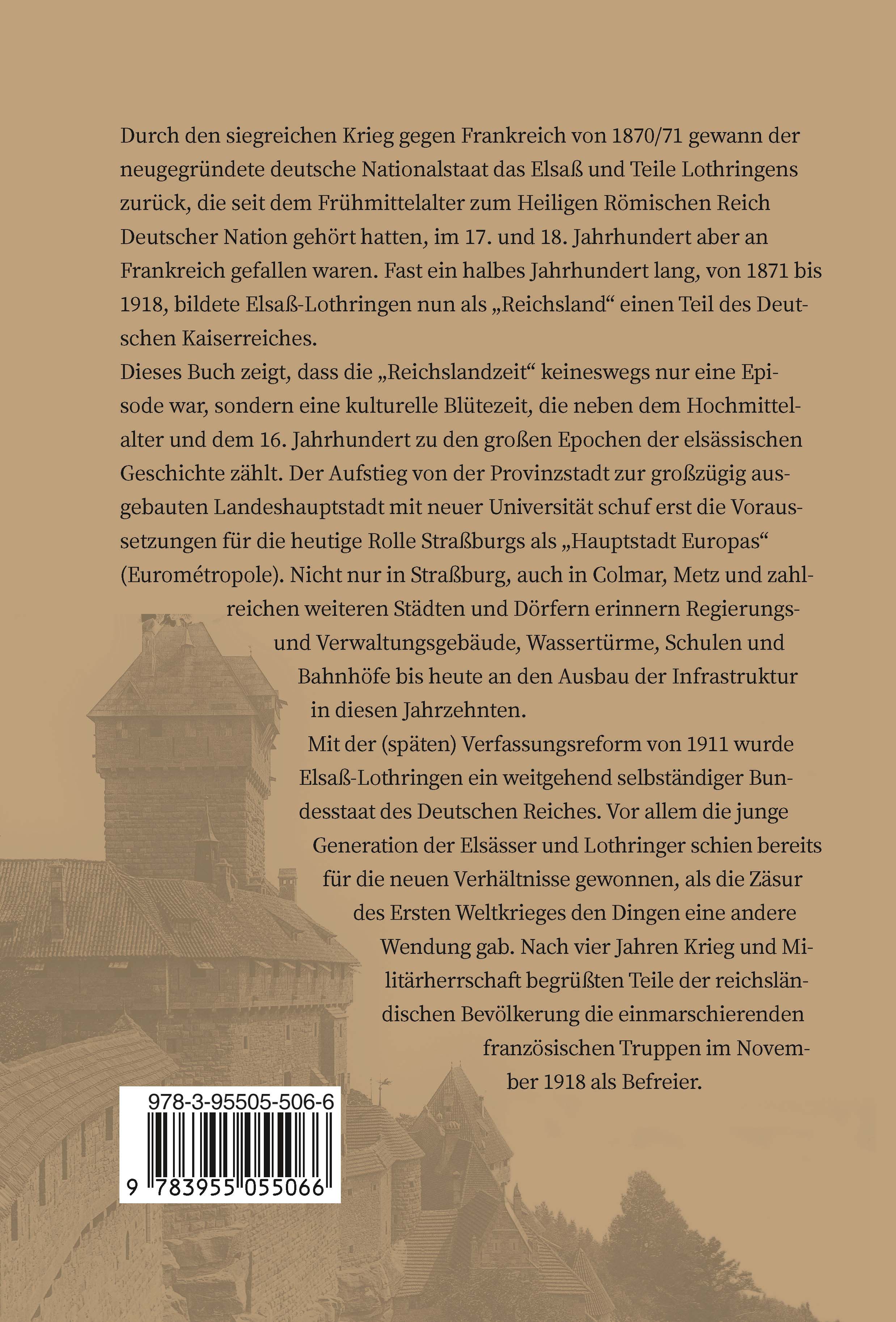 Durch den siegreichen Krieg gegen Frankreich von 1870/71 gewann der neugegründete deutsche Nationalstaat das Elsaß und Teile Lothringens zurück, die seit dem Frühmittelalter zum Heiligen Römischen Reich Deutscher Nation gehört hatten, im 17. und 18. Jahrhundert aber an Frankreich gefallen waren. Fast ein halbes Jahrhundert lang, von 1871 bis 1918, bildete Elsaß-Lothringen nun als "Reichsland" einen Teil des Deutschen Kaiserreiches.Dieses Buch zeigt, dass die "Reichslandzeit" keineswegs nur eine Episode war, sondern eine kulturelle Blütezeit, die neben dem Hochmittelalter und dem 16. Jahrhundert zu den großen Epochen der elsässischen Geschichte zählt. Der Aufstieg von der Provinzstadt zur großzügig ausgebauten Landeshauptstadt mit neuer Universität schuf erst die Voraussetzungen für die heutige Rolle Straßburgs als "Hauptstadt Europas" (Eurométropole). Nicht nur in Straßburg, auch in Colmar, Metz und zahlreichen weiteren Städten und Dörfern erinnern Regierungs- und Verwaltungsgebäude, Wassertürme, Schulen und Bahnhöfe bis heute an den Ausbau der Infrastruktur in diesen Jahrzehnten.Mit der (späten) Verfassungsreform von 1911 wurde Elsaß-Lothringen ein weitgehend selbständiger Bundesstaat des Deutschen Reiches. Vor allem die junge Generation der Elsässer und Lothringer schien bereits für die neuen Verhältnisse gewonnen, als die Zäsur des Ersten Weltkrieges den Dingen eine andere Wendung gab. Nach vier Jahren Krieg und Militärherrschaft begrüßten Teile der reichsländischen Bevölkerung die einmarschierenden französischen Truppen im November 1918 als Befreier.