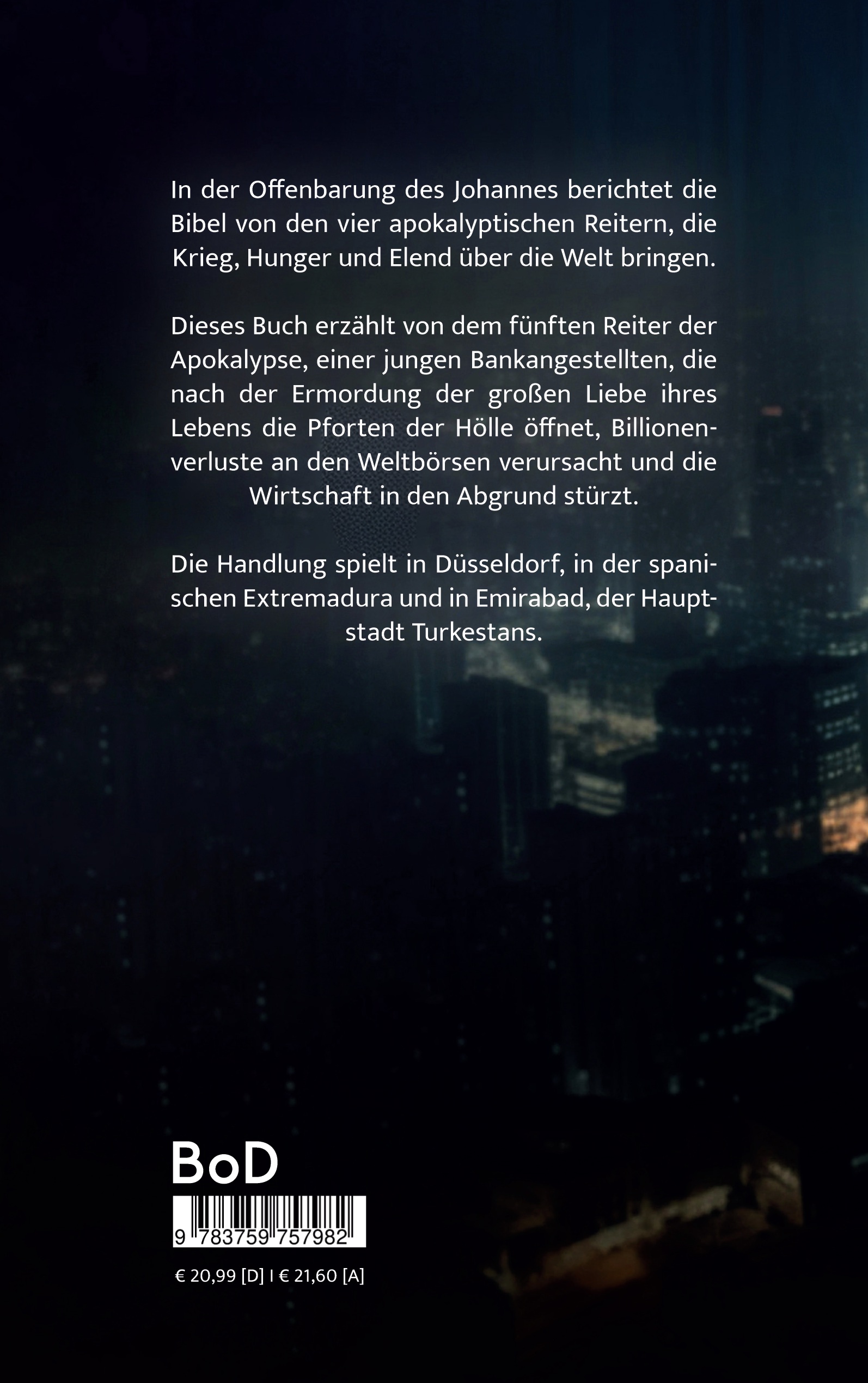 Dieses Buch erzählt von dem fünften Reiter der Apokalypse, einer jungen Bankangestellten, die nach der Ermordung der großen Liebe ihres Lebens die Pforten der Hölle öffnet, Billionenverluste an den Weltbörsen verursacht und die Wirtschaft in den Abgrund stürzt.