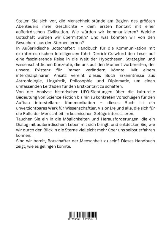 Stellen Sie sich vor, die Menschheit stünde am Beginn des größten Abenteuers ihrer Geschichte - dem ersten Kontakt mit einer außerirdischen Zivilisation. Wie würden wir kommunizieren? Welche Botschaft würden wir übermitteln? Und was könnten wir von den Besuchern aus den Sternen lernen?In Außerirdische Botschafter: Handbuch für die Kommunikation mit extraterrestrischen Intelligenzen führt Derrick Crawford den Leser auf eine faszinierende Reise in die Welt der Hypothesen, Strategien und wissenschaftlichen Konzepte, die uns auf den Moment vorbereiten, der unsere Existenz für immer verändern könnte. Mit einem interdisziplinären Ansatz vereint dieses Buch Erkenntnisse aus Astrobiologie, Linguistik, Philosophie und Diplomatie, um einen umfassenden Leitfaden für den Erstkontakt zu schaffen.Von der Analyse historischer UFO-Sichtungen über die kulturelle Bedeutung von Science-Fiction bis hin zu konkreten Vorschlägen für den Aufbau interstellarer Kommunikation - dieses Buch ist ein unverzichtbares Werk für Wissenschaftler, Visionäre und alle, die sich für die Rolle der Menschheit im kosmischen Gefüge interessieren.Tauchen Sie ein in die Möglichkeiten und Herausforderungen, die ein Dialog mit außerirdischem Leben mit sich bringt, und entdecken Sie, wie wir durch den Blick in die Sterne vielleicht mehr über uns selbst erfahren können.Sind wir bereit, Botschafter der Menschheit zu sein? Dieses Handbuch zeigt, wie es gelingen könnte.