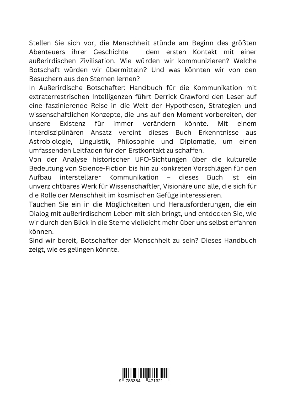 Stellen Sie sich vor, die Menschheit stünde am Beginn des größten Abenteuers ihrer Geschichte - dem ersten Kontakt mit einer außerirdischen Zivilisation. Wie würden wir kommunizieren? Welche Botschaft würden wir übermitteln? Und was könnten wir von den Besuchern aus den Sternen lernen?In Außerirdische Botschafter: Handbuch für die Kommunikation mit extraterrestrischen Intelligenzen führt Derrick Crawford den Leser auf eine faszinierende Reise in die Welt der Hypothesen, Strategien und wissenschaftlichen Konzepte, die uns auf den Moment vorbereiten, der unsere Existenz für immer verändern könnte. Mit einem interdisziplinären Ansatz vereint dieses Buch Erkenntnisse aus Astrobiologie, Linguistik, Philosophie und Diplomatie, um einen umfassenden Leitfaden für den Erstkontakt zu schaffen.Von der Analyse historischer UFO-Sichtungen über die kulturelle Bedeutung von Science-Fiction bis hin zu konkreten Vorschlägen für den Aufbau interstellarer Kommunikation - dieses Buch ist ein unverzichtbares Werk für Wissenschaftler, Visionäre und alle, die sich für die Rolle der Menschheit im kosmischen Gefüge interessieren.Tauchen Sie ein in die Möglichkeiten und Herausforderungen, die ein Dialog mit außerirdischem Leben mit sich bringt, und entdecken Sie, wie wir durch den Blick in die Sterne vielleicht mehr über uns selbst erfahren können.Sind wir bereit, Botschafter der Menschheit zu sein? Dieses Handbuch zeigt, wie es gelingen könnte.