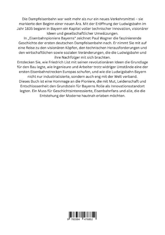 Die Dampfeisenbahn war weit mehr als nur ein neues Verkehrsmittel - sie markierte den Beginn einer neuen Ära. Mit der Eröffnung der Ludwigsbahn im Jahr 1835 begann in Bayern ein Kapitel voller technischer Innovation, visionärer Ideen und gesellschaftlicher Umwälzungen.In "Eisenbahnpioniere Bayerns" zeichnet Paul Wagner die faszinierende Geschichte der ersten deutschen Dampfeisenbahn nach. Er nimmt Sie mit auf eine Reise zu den visionären Köpfen, den technischen Herausforderungen und den wirtschaftlichen sowie sozialen Veränderungen, die die Ludwigsbahn und ihre Nachfolger mit sich brachten.Entdecken Sie, wie Friedrich List mit seinen revolutionären Ideen die Grundlage für den Bau legte, wie Ingenieure und Arbeiter trotz widriger Umstände eine der ersten Eisenbahnstrecken Europas schufen, und wie die Ludwigsbahn Bayern nicht nur industrialisierte, sondern auch eng mit der Welt verband.Dieses Buch ist eine Hommage an die Pioniere, die mit Mut, Leidenschaft und Entschlossenheit den Grundstein für Bayerns Rolle als Innovationsstandort legten. Ein Muss für Geschichtsinteressierte, Eisenbahnfans und alle, die die Entstehung der Moderne hautnah erleben möchten.