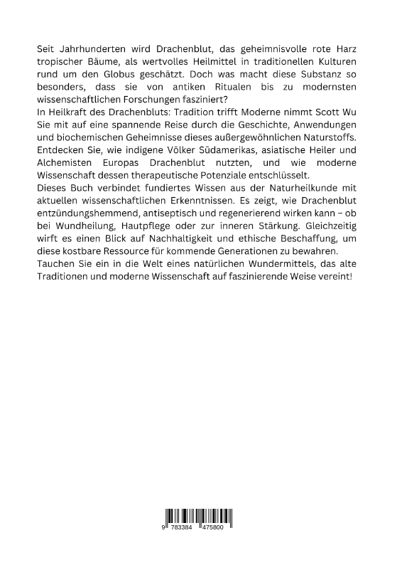 Seit Jahrhunderten wird Drachenblut, das geheimnisvolle rote Harz tropischer Bäume, als wertvolles Heilmittel in traditionellen Kulturen rund um den Globus geschätzt. Doch was macht diese Substanz so besonders, dass sie von antiken Ritualen bis zu modernsten wissenschaftlichen Forschungen fasziniert?In Heilkraft des Drachenbluts: Tradition trifft Moderne nimmt Scott Wu Sie mit auf eine spannende Reise durch die Geschichte, Anwendungen und biochemischen Geheimnis-se dieses außergewöhnlichen Naturstoffs. Entdecken Sie, wie indigene Völker Südamerikas, asiatische Heiler und Alchemisten Europas Drachenblut nutzten, und wie moderne Wissenschaft dessen therapeutische Potenziale entschlüsselt.Dieses Buch verbindet fundiertes Wissen aus der Naturheilkunde mit aktuellen wissenschaftlichen Erkenntnissen. Es zeigt, wie Drachenblut entzündungshemmend, antiseptisch und regenerierend wirken kann - ob bei Wundheilung, Hautpflege oder zur inneren Stärkung. Gleichzeitig wirft es einen Blick auf Nachhaltigkeit und ethische Beschaffung, um diese kostbare Ressource für kommende Generationen zu bewahren.Tauchen Sie ein in die Welt eines natürlichen Wundermittels, das alte Traditionen und moderne Wissenschaft auf faszinierende Weise vereint!