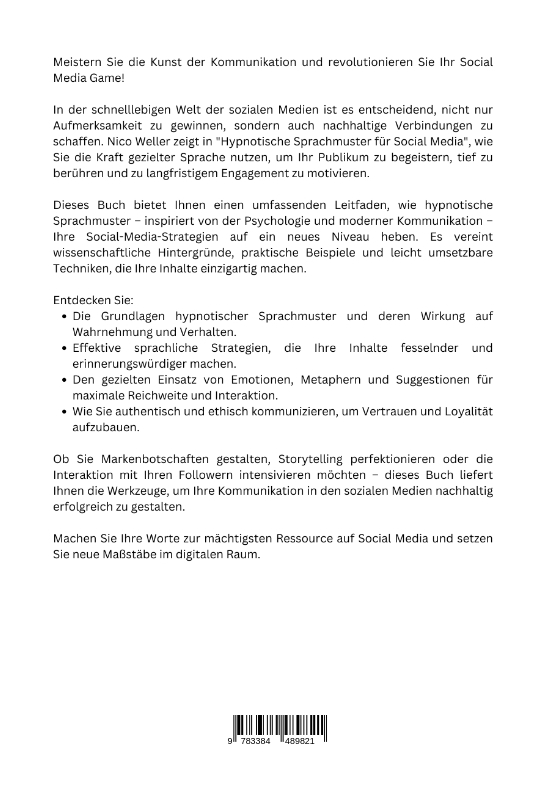 Meistern Sie die Kunst der Kommunikation und revolutionieren Sie Ihr Social Media Game!In der schnelllebigen Welt der sozialen Medien ist es entscheidend, nicht nur Aufmerksamkeit zu gewinnen, sondern auch nachhaltige Verbindungen zu schaffen. Nico Weller zeigt in "Hypnotische Sprachmuster für Social Media", wie Sie die Kraft gezielter Sprache nutzen, um Ihr Publikum zu begeistern, tief zu berühren und zu langfristigem Engagement zu motivieren.Dieses Buch bietet Ihnen einen umfassenden Leitfaden, wie hypnotische Sprachmuster - inspiriert von der Psychologie und moderner Kommunikation - Ihre Social-Media-Strategien auf ein neues Niveau heben. Es vereint wissenschaftliche Hintergründe, praktische Beispiele und leicht umsetzbare Techniken, die Ihre Inhalte einzigartig machen.Entdecken Sie:Die Grundlagen hypnotischer Sprachmuster und deren Wirkung auf Wahrnehmung und Verhalten.Effektive sprachliche Strategien, die Ihre Inhalte fesselnder und erinnerungswürdiger machen.Den gezielten Einsatz von Emotionen, Metaphern und Suggestionen für maximale Reichweite und Interaktion.Wie Sie authentisch und ethisch kommunizieren, um Vertrauen und Loyalität aufzubauen.Ob Sie Markenbotschaften gestalten, Storytelling perfektionieren oder die Interaktion mit Ihren Followern intensivieren möchten - dieses Buch liefert Ihnen die Werkzeuge, um Ihre Kommunikation in den sozialen Medien nachhaltig erfolgreich zu gestalten.Machen Sie Ihre Worte zur mächtigsten Ressource auf Social Media und setzen Sie neue Maßstäbe im digitalen Raum.Falls weitere Anpassungen gewünscht sind, lassen Sie es mich wissen!