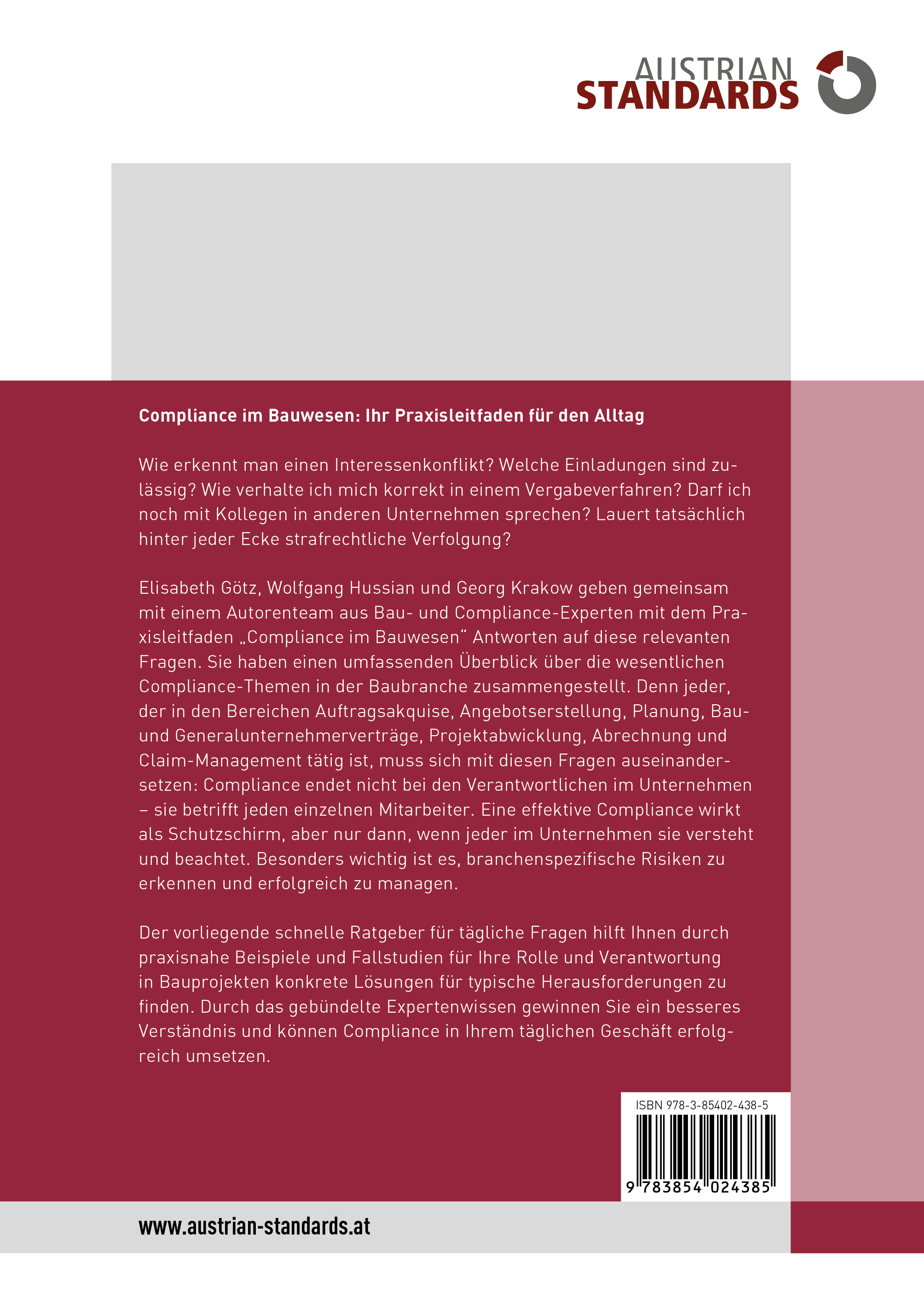 Elisabeth Götz, Wolfgang Hussian und Georg Krakow geben gemeinsam mit einem Autorenteam aus Bau- und Compliance-Experten mit dem Praxisleitfaden „Compliance im Bauwesen“ Antworten auf diese relevanten Fragen. Sie haben einen umfassenden Überblick über die wesentlichen Compliance-Themen in der Baubranche zusammengestellt. Denn jeder, der in den Bereichen Auftragsakquise, Angebotserstellung, Planung, Bau- und Generalunternehmerverträge, Projektabwicklung, Abrechnung und Claim-Management tätig ist, muss sich mit diesen Fragen auseinandersetzen: Compliance endet nicht bei den Verantwortlichen im Unternehmen – sie betrifft jeden einzelnen Mitarbeiter. Eine effektive Compliance wirkt als Schutzschirm, aber nur dann, wenn jeder im Unternehmen sie versteht und beachtet. Besonders wichtig ist es, branchenspezifische Risiken zu erkennen und erfolgreich zu managen.