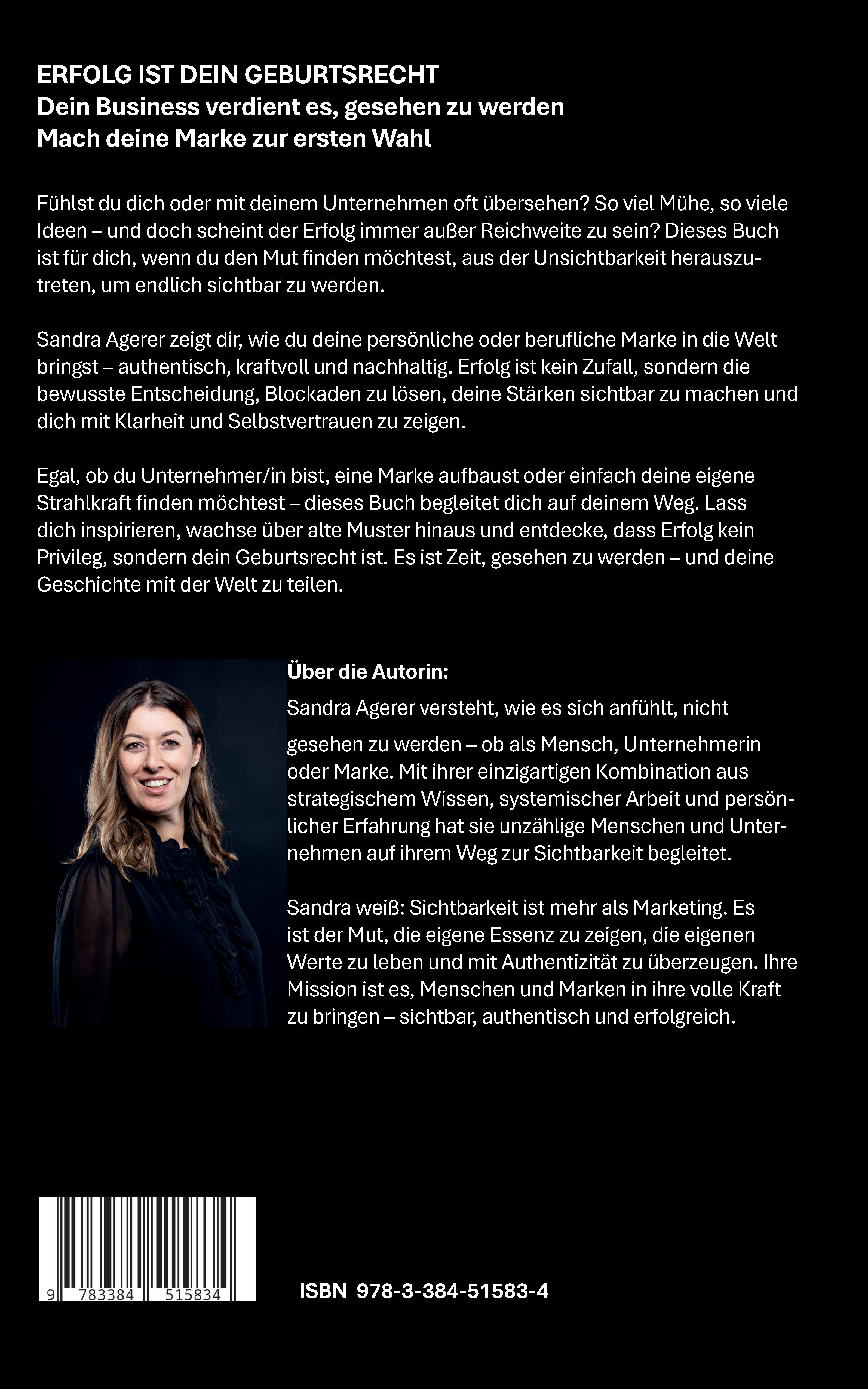 Sandra Agerer ist die Gründerin eines einzigartigen Fullservice-Ansatzes, der Unternehmer, Selbstständige und Führungskräfte dabei unterstützt, ihre Identität in eine starke, sichtbare Marke zu verwandeln. Mit ihrem Team aus 14 Experten vereint sie systemisches Coaching, klare Unternehmensstrukturen und strategisches Marketing, um langfristigen Erfolg zu schaffen – alles nach ihrem ganzheitlichen LMS Prinzip: Life, Mind, Success. Mit Leidenschaft und Expertise begleitet Sandra Agerer Menschen, die am Anfang ihrer unternehmerischen Reise stehen, bereits ein etabliertes Unternehmen führen oder nach ihrem persönlichen Potenzial suchen. Gemeinsam mit ihrem Team entwickelt sie klare Strukturen, effiziente Prozesse und eine nachhaltige Ausrichtung für Unternehmen. Ihr Fokus liegt darauf, authentische Marken zu kreieren, die Vertrauen aufbauen und nachhaltig erfolgreich sind. Sandra und ihr Team übernehmen für ihre Kunden alle operativen Aufga- ben – von Branding und Webdesign bis hin zu Social Media, E-Mail- und Performance-Marketing. Ihr Ziel: Menschen nicht nur zu stärken, sondern auch eine authentische Marke zu schaffen, die sichtbar wird, Vertrauen gewinnt und langfristigen Erfolg ermöglicht. Mit Sandra Agerer beginnt die Reise zu einer authentischen Marke und nachhaltigem Unternehmertum.
