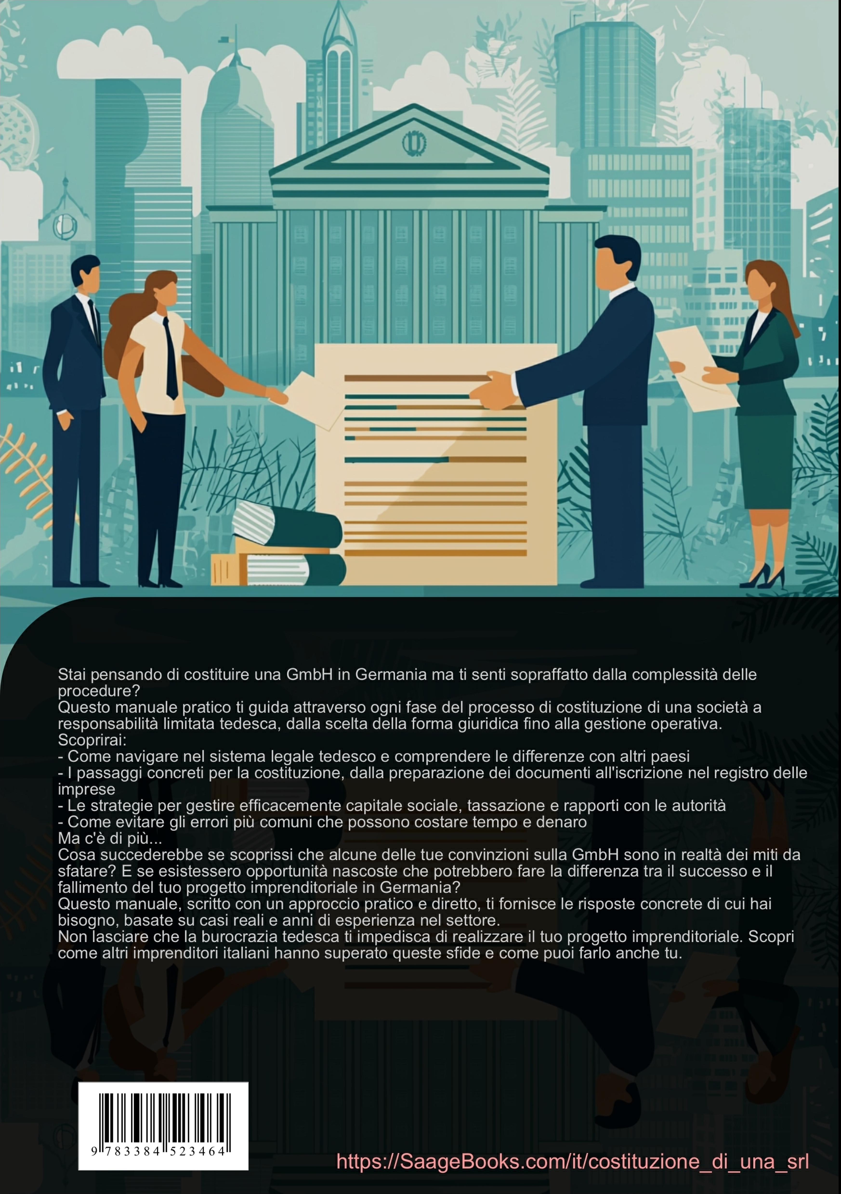 Questa guida pratica offre un'analisi dettagliata del processo di costituzione di una GmbH tedesca (società a responsabilità limitata tedesca), fornendo informazioni essenziali per imprenditori italiani interessati ad avviare un'attività in Germania.Il manuale si articola in sei sezioni principali che coprono tutti gli aspetti fondamentali:- Le basi giuridiche della GmbH, con focus sulla legislazione societaria tedesca e le normative sulla responsabilità limitata- Il processo di costituzione in Germania, dalla preparazione del contratto sociale alle registrazioni necessarie- L'internazionalizzazione della GmbH, con confronti tra forme societarie internazionali e specifiche per investitori esteri- La gestione finanziaria, inclusi aspetti di capitale sociale, contabilità e fiscalità- La gestione strategica aziendale, con particolare attenzione ai doveri degli amministratori- L'operatività quotidiana, dalla gestione amministrativa alle relazioni con dipendenti e partner commercialiOgni capitolo contiene grafici e tabelle esplicative che illustrano dati chiave e confronti pratici. Il testo affronta in modo sistematico:- Requisiti legali e amministrativi per la costituzione- Procedure di registrazione e documentazione necessaria- Gestione del capitale sociale e aspetti finanziari- Obblighi fiscali e contabili- Responsabilità degli amministratori- Rapporti con le autorità tedescheQuesta guida rappresenta uno strumento di orientamento per chi desidera costituire una società a responsabilità limitata tedesca, offrendo indicazioni concrete sulle procedure da seguire e gli adempimenti da rispettare.Questo libro è stato creato utilizzando tecnologie innovative come l'Intelligenza Artificiale e strumenti sviluppati appositamente - ad esempio, nella ricerca di idee, nella ricerca, nella scrittura, nella redazione, nel controllo qualità e nella progettazione di illustrazioni decorative.In questo modo, vogliamo offrirvi un'esperienza di lettura particolarmente coerente, moderna e di qualità ancora superiore.