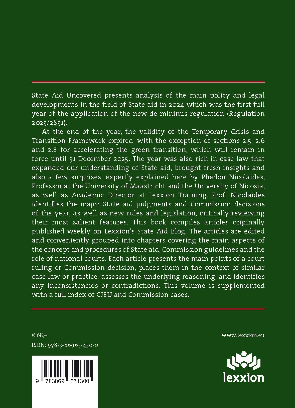 At the end of the year, the validity of the Temporary Crisis and Transition Framework expired, with the exception of sections 2.5, 2.6 and 2.8 for accelerating the green transition, which will remain in force until 31 December 2025. The year was also rich in case law that expanded our understanding of State aid, brought fresh insights and also a few surprises, expertly explained here by Phedon Nicolaides, Professor at the University of Maastricht and the University of Nicosia, as well as Academic Director at Lexxion Training. Prof. Nicolaides identifies the major State aid judgments and Commission decisions of the year, as well as new rules and legislation, critically reviewing their most salient features. This book compiles articles originally published weekly on Lexxion’s State Aid Blog. The articles are edited and conveniently grouped into chapters covering the main aspects of the concept and procedures of State aid, Commission guidelines and the role of national courts. Each article presents the main points of a court ruling or Commission decision, places them in the context of similar case law or practice, assesses the underlying reasoning, and identifies any inconsistencies or contradictions. This volume is supplemented with a full index of CJEU and Commission cases.