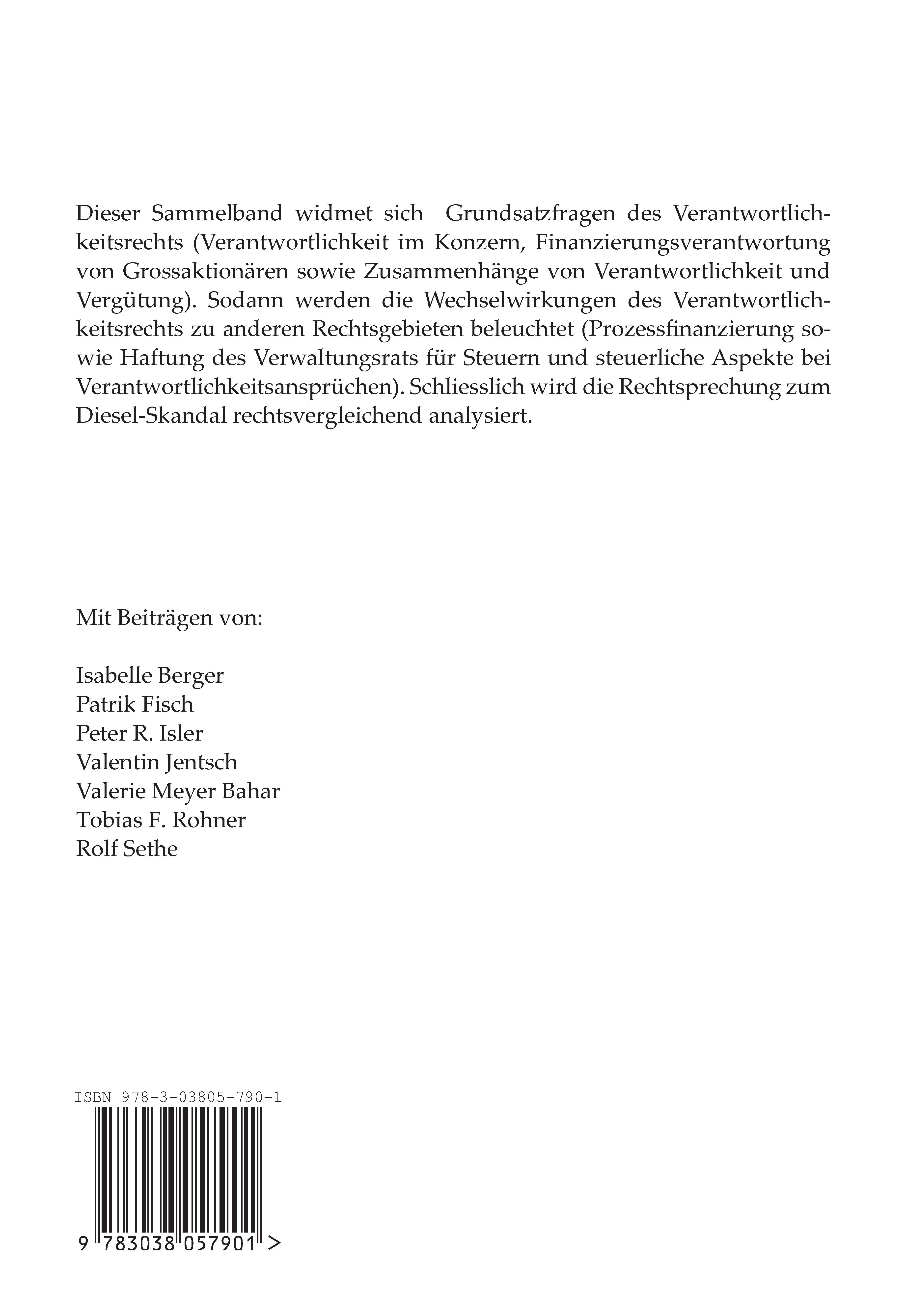 Dieser Sammelband widmet sich Grundsatzfragen des Verantwortlichkeitsrechts (Verantwortlichkeit im Konzern, Finanzierungsverantwortung von Grossaktionären sowie Zusammenhänge von Verantwortlichkeit und Vergütung). Sodann werden die Wechselwirkungen des Verantwortlichkeitsrechts zu anderen Rechtsgebieten beleuchtet (Prozessfinanzierung sowie Haftung des Verwaltungsrats für Steuern und steuerliche Aspekte bei Verantwortlichkeitsansprüchen). Schliesslich wird die Rechtsprechung zum Diesel-Skandal rechtsvergleichend analysiert.