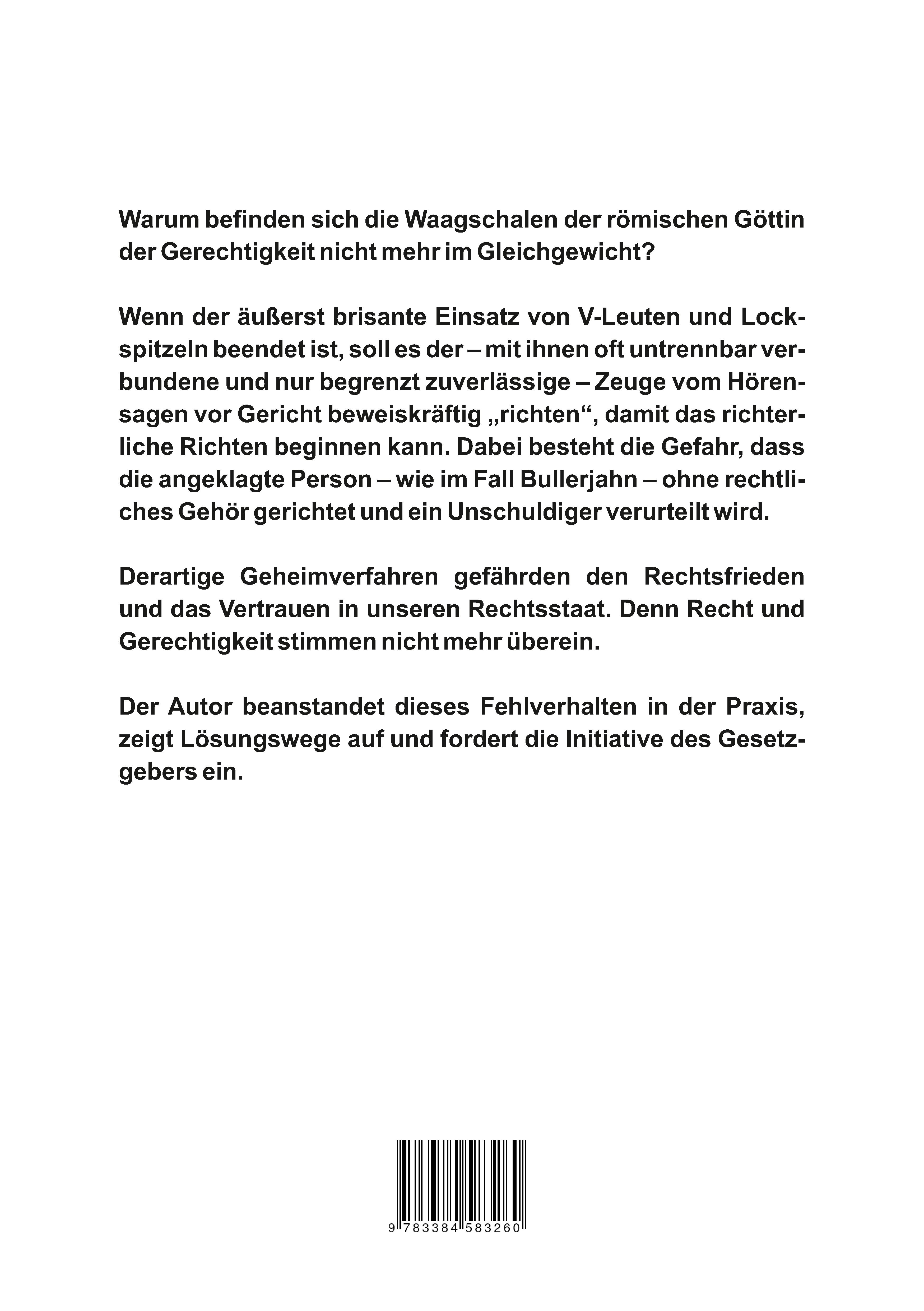 Warum befinden sich die Waagschalen der römischen Göttin der Gerechtigkeit nicht mehr im Gleichgewicht? Wenn der äußerst brisante Einsatz von V-Leuten und Lockspitzeln beendet ist, soll es der - mit ihnen oft untrennbar verbundene und nur begrenzt zuverlässige - Zeuge vom Hörensagen vor Gericht beweiskräftig "richten", damit das richterliche Richten beginnen kann. Dabei besteht die Gefahr, dass die angeklagte Person - wie im Fall Bullerjahn - ohne rechtliches Gehör gerichtet und ein Unschuldiger verurteilt wird. Derartige Geheimverfahren gefährden den Rechtsfrieden und das Vertrauen in unseren Rechtsstaat. Denn Recht und Gerechtigkeit stimmen nicht mehr überein. Der Autor beanstandet dieses Fehlverhalten in der Praxis, zeigt Lösungswege auf und fordert die Initiative des Gesetzgebers ein.