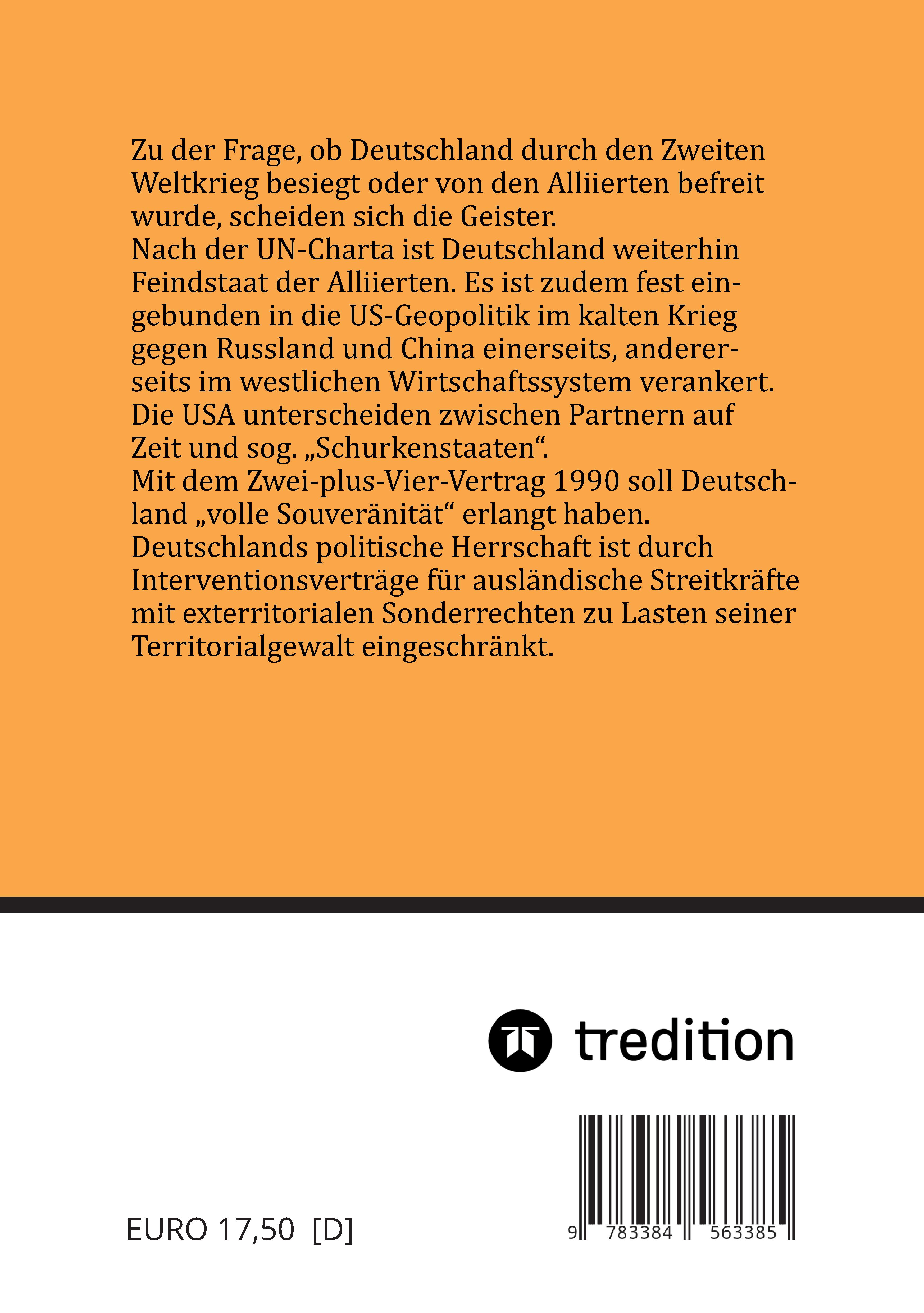 Die Frage, ob Deutschland durch den Zweiten Weltkrieg besiegt oder von den Alliierten befreit wurde, ist nach wie vor umstritten.Gemäß der UN-Charta ist Deutschland weiterhin als Feindstaat der Alliierten eingestuft. Es ist zudem fest in die US-Geopolitik im Kalten Krieg gegen Russland und China einerseits und andererseits in das westliche Wirtschaftssystem verankert.Die USA unterscheiden zwischen Partnern auf Zeit und sogenannten "Schurkenstaaten".Nach dem Zwei-Plus-Vier-Vertrag von 1990 hat Deutschland zwar "volle Souveränität" erlangt, jedoch durch Interventionsverträge für ausländische Streitkräfte mit exterritorialen Sonderrechten zu Lasten seiner territorialen Gewalt stark eingeschränkt.