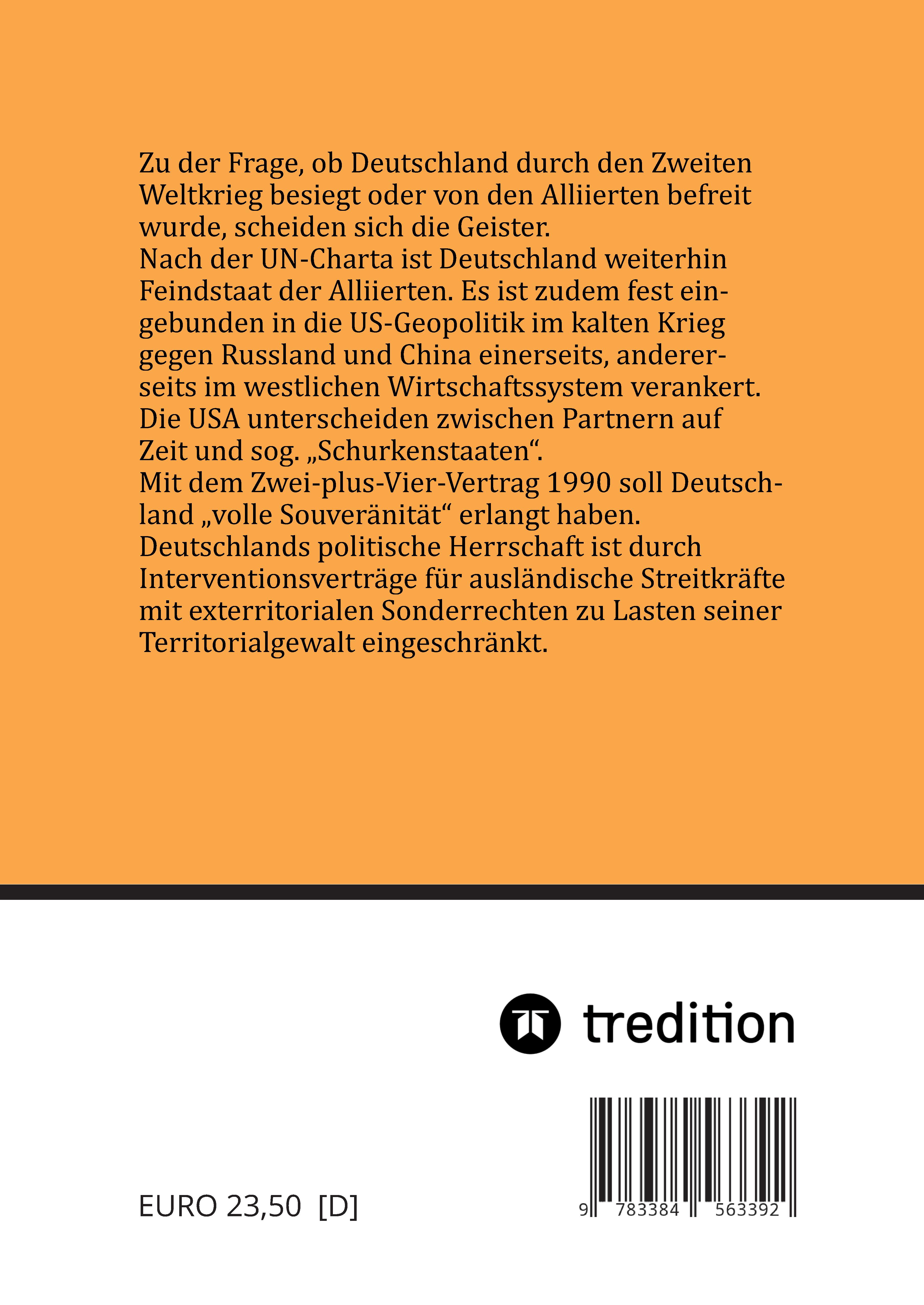 Die Frage, ob Deutschland durch den Zweiten Weltkrieg besiegt oder von den Alliierten befreit wurde, ist nach wie vor umstritten.Gemäß der UN-Charta ist Deutschland weiterhin als Feindstaat der Alliierten eingestuft. Es ist zudem fest in die US-Geopolitik im Kalten Krieg gegen Russland und China einerseits und andererseits in das westliche Wirtschaftssystem verankert.Die USA unterscheiden zwischen Partnern auf Zeit und sogenannten "Schurkenstaaten".Nach dem Zwei-Plus-Vier-Vertrag von 1990 hat Deutschland zwar "volle Souveränität" erlangt, jedoch durch Interventionsverträge für ausländische Streitkräfte mit exterritorialen Sonderrechten zu Lasten seiner territorialen Gewalt stark eingeschränkt.