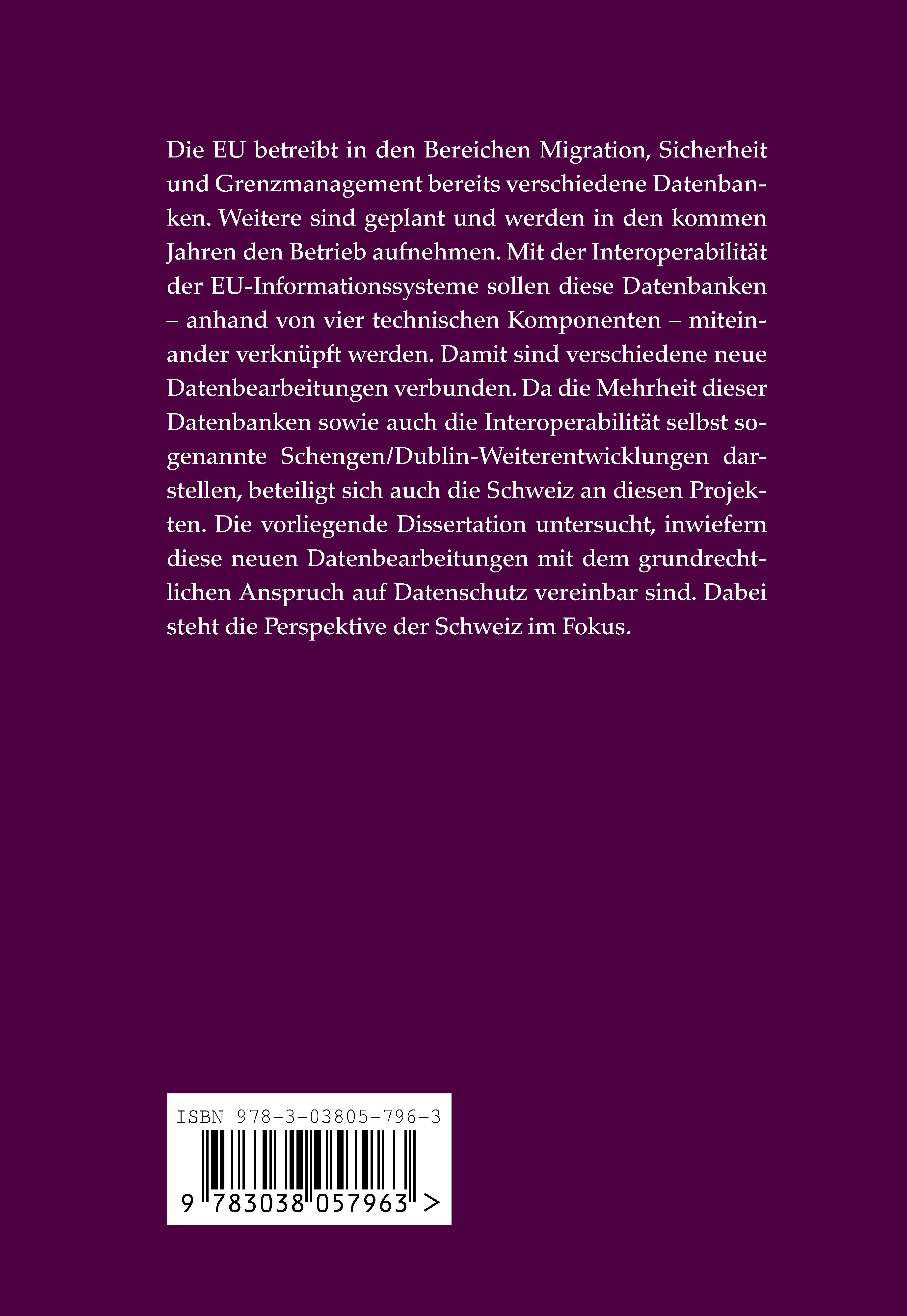 Die EU betreibt in den Bereichen Migration, Sicherheit und Grenzmanagement bereits verschiedene Datenbanken. Weitere sind geplant und werden in den kommen Jahren den Betrieb aufnehmen. Mit der Interoperabilität der EU-Informationssysteme sollen diese Datenbanken - anhand von vier technischen Komponenten - miteinander verknüpft werden. Damit sind verschiedene neue Datenbearbeitungen verbunden. Da die Mehrheit dieser Datenbanken sowie auch die Interoperabilität selbst sogenannte Schengen/Dublin-Weiterentwicklungen darstellen, beteiligt sich auch die Schweiz an diesen Projekten. Die vorliegende Dissertation untersucht, inwiefern diese neuen Datenbearbeitungen mit dem grundrechtlichen Anspruch auf Datenschutz vereinbar sind. Dabei steht die Perspektive der Schweiz im Fokus.