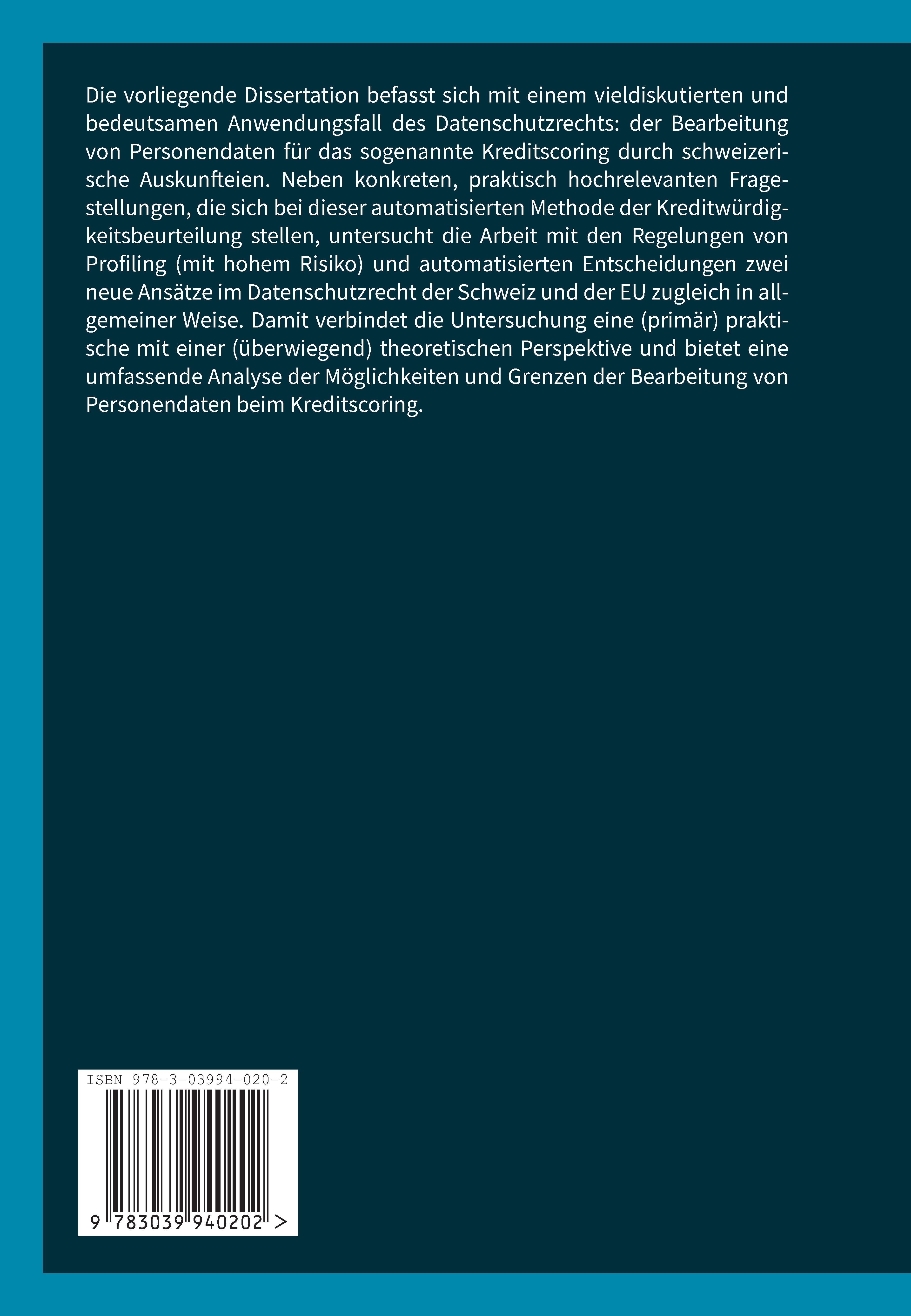 Die vorliegende Publikation befasst sich mit einem viel diskutierten und bedeutsamen Anwendungsfall des Datenschutzrechts: der Bearbeitung von Personendaten für das sogenannte Kreditscoring durch schweizerische Auskunfteien. Neben konkreten, praktisch hochrelevanten Fragestellungen, die sich bei dieser automatisierten Methode der Kreditwürdigkeitsbeurteilung stellen, untersucht die Arbeit mit den Regelungen von Profiling (mit hohem Risiko) und automatisierten Entscheidungen zwei neue Ansätze im Datenschutzrecht der Schweiz und der EU zugleich in allgemeiner Weise. Damit verbindet die Untersuchung eine (primär) praktische mit einer (überwiegend) theoretischen Perspektive und bietet eine umfassende Analyse der Möglichkeiten und Grenzen der Bearbeitung von Personendaten beim Kreditscoring.