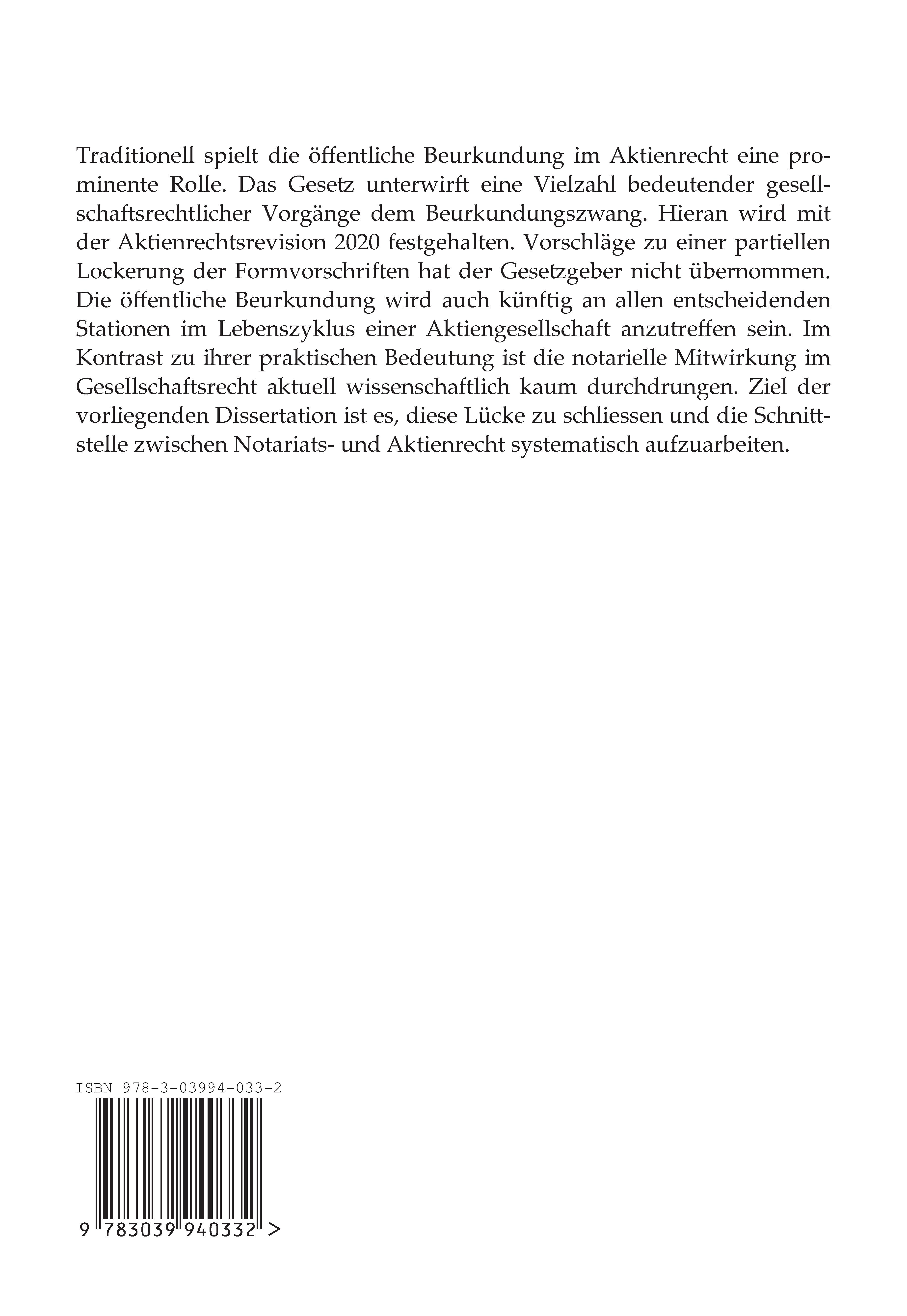 Traditionell spielt die öffentliche Beurkundung im Aktienrecht eine prominente Rolle. Das Gesetz unterwirft eine Vielzahl bedeutender gesellschaftsrechtlicher Vorgänge dem Beurkundungszwang. Hieran wird mit der Aktienrechtsrevision 2020 festgehalten. Vorschläge zu einer partiellen Lockerung der Formvorschriften hat der Gesetzgeber nicht übernommen. Die öffentliche Beurkundung wird auch künftig an allen entscheidenden Stationen im Lebenszyklus einer Aktiengesellschaft anzutreffen sein. Im Kontrast zu ihrer praktischen Bedeutung ist die notarielle Mitwirkung im Gesellschaftsrecht aktuell wissenschaftlich kaum durchdrungen. Ziel der vorliegenden Dissertation ist es, diese Lücke zu schliessen und die Schnittstelle zwischen Notariats- und Aktienrecht systematisch aufzuarbeiten.