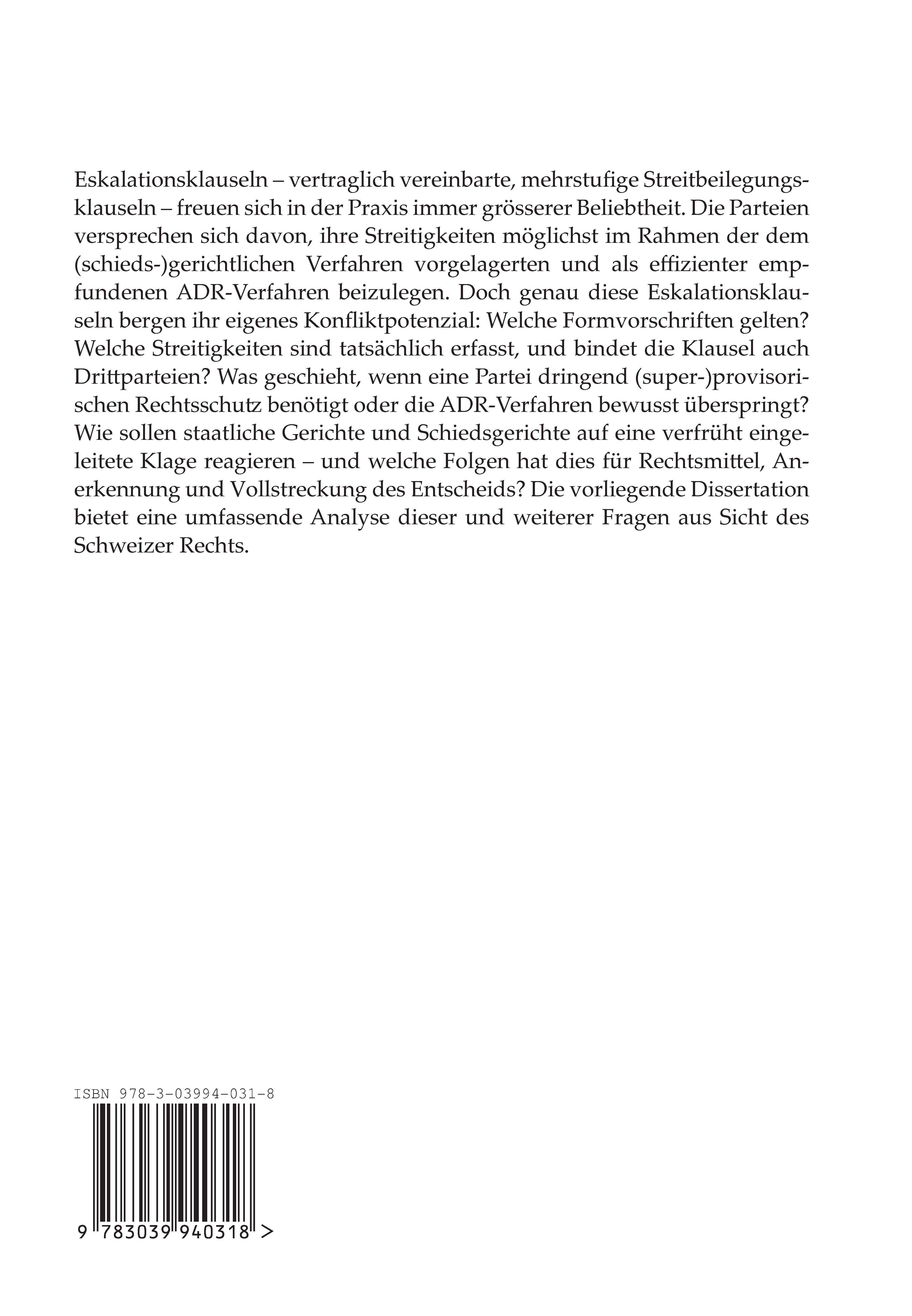 Eskalationsklauseln - vertraglich vereinbarte, mehrstufige Streitbeilegungsklauseln - freuen sich in der Praxis immer grösserer Beliebtheit. Die Parteien versprechen sich davon, ihre Streitigkeiten möglichst im Rahmen der dem (schieds-)gerichtlichen Verfahren vorgelagerten und als effizienter empfundenen ADR-Verfahren beizulegen. Doch genau diese Eskalationsklauseln bergen ihr eigenes Konfliktpotenzial: Welche Formvorschriften gelten? Welche Streitigkeiten sind tatsächlich erfasst, und bindet die Klausel auch Drittparteien? Was geschieht, wenn eine Partei dringend (super-)provisorischen Rechtsschutz benötigt oder die ADR-Verfahren bewusst überspringt? Wie sollen staatliche Gerichte und Schiedsgerichte auf eine verfrüht eingeleitete Klage reagieren - und welche Folgen hat dies für Rechtsmittel, Anerkennung und Vollstreckung des Entscheids? Die vorliegende Dissertation bietet eine umfassende Analyse dieser und weiterer Fragen aus Sicht des Schweizer Rechts.