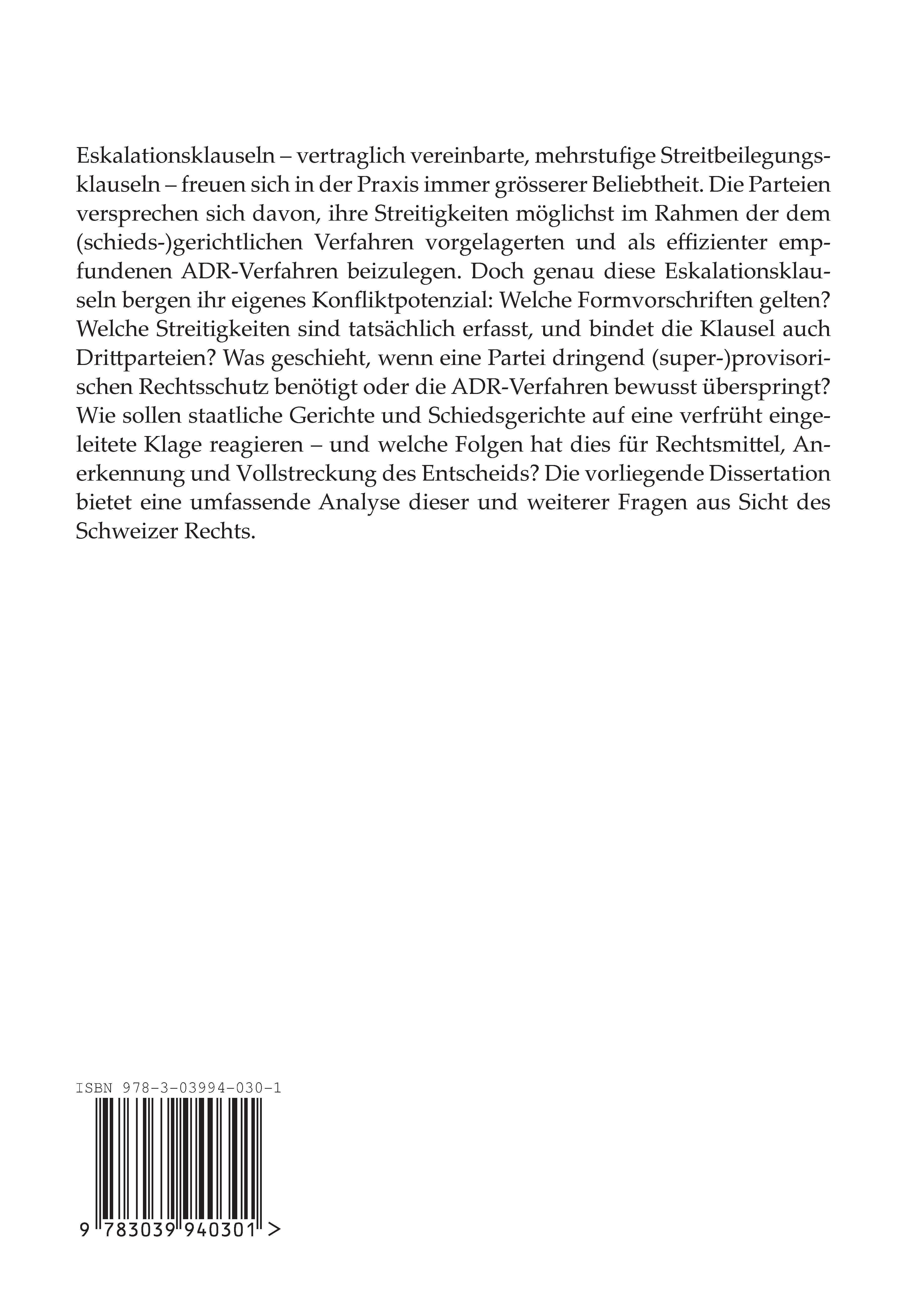 Eskalationsklauseln - vertraglich vereinbarte, mehrstufige Streitbeilegungsklauseln - freuen sich in der Praxis immer grösserer Beliebtheit. Die Parteien versprechen sich davon, ihre Streitigkeiten möglichst im Rahmen der dem (schieds-)gerichtlichen Verfahren vorgelagerten und als effizienter empfundenen ADR-Verfahren beizulegen. Doch genau diese Eskalationsklauseln bergen ihr eigenes Konfliktpotenzial: Welche Formvorschriften gelten? Welche Streitigkeiten sind tatsächlich erfasst, und bindet die Klausel auch Drittparteien? Was geschieht, wenn eine Partei dringend (super-)provisorischen Rechtsschutz benötigt oder die ADR-Verfahren bewusst überspringt? Wie sollen staatliche Gerichte und Schiedsgerichte auf eine verfrüht eingeleitete Klage reagieren - und welche Folgen hat dies für Rechtsmittel, Anerkennung und Vollstreckung des Entscheids? Die vorliegende Dissertation bietet eine umfassende Analyse dieser und weiterer Fragen aus Sicht des Schweizer Rechts.
