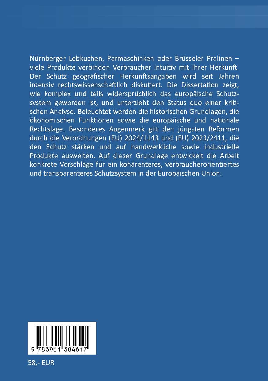 Nürnberger Lebkuchen, Parmaschinken oder Brüsseler Pralinen viele Produkte verbinden Verbraucher intuitiv mit ihrer Herkunft. Der Schutz geografischer Herkunftsangaben wird seit Jahren intensiv rechtswissenschaftlich diskutiert. Die Dissertation zeigt, wie komplex und teils widersprüchlich das europäische Schutz-system geworden ist, und unterzieht den Status quo einer kriti-schen Analyse. Beleuchtet werden die historischen Grundlagen, ökonomischen Funktionen sowie die europäische und nationale Rechtslage. Besonderes Augenmerk gilt den jüngsten Reformen durch die Verordnungen (EU) 2024/1143 und (EU) 2023/2411, den Schutz stärken und auf handwerkliche sowie industrielle Produkte ausweiten. Auf dieser Grundlage entwickelt die Arbeit konkrete Vorschläge für ein kohärenteres, verbraucherorientiertes und transparenteres Schutzsystem in der Europäischen Union.