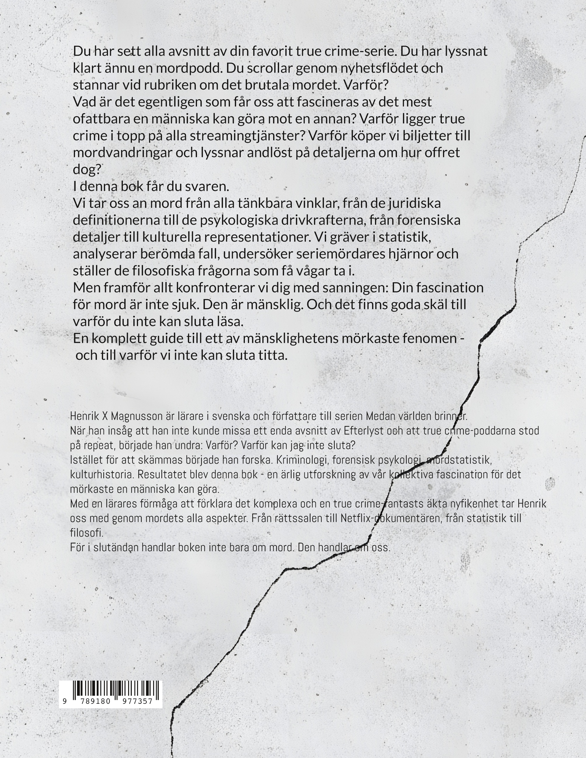 Henrik X Magnusson är lärare i svenska och författare till serien Medan världen brinner. När han insåg att han inte kunde missa ett enda avsnitt av Efterlyst och att true crime-poddarna stod på repeat, började han undra: Varför? Varför kan jag inte sluta? Istället för att skämmas började han forska. Kriminologi, forensisk psykologi, mordstatistik, kulturhistoria. Resultatet blev denna bok - en ärlig utforskning av vår kollektiva fascination för det mörkaste en människa kan göra. Med en lärares förmåga att förklara det komplexa och en true crime-fantasts äkta nyfikenhet tar Henrik oss med genom mordets alla aspekter. Från rättssalen till Netflix-dokumentären, från statistik till filosofi. För i slutändan handlar boken inte bara om mord. Den handlar om oss.