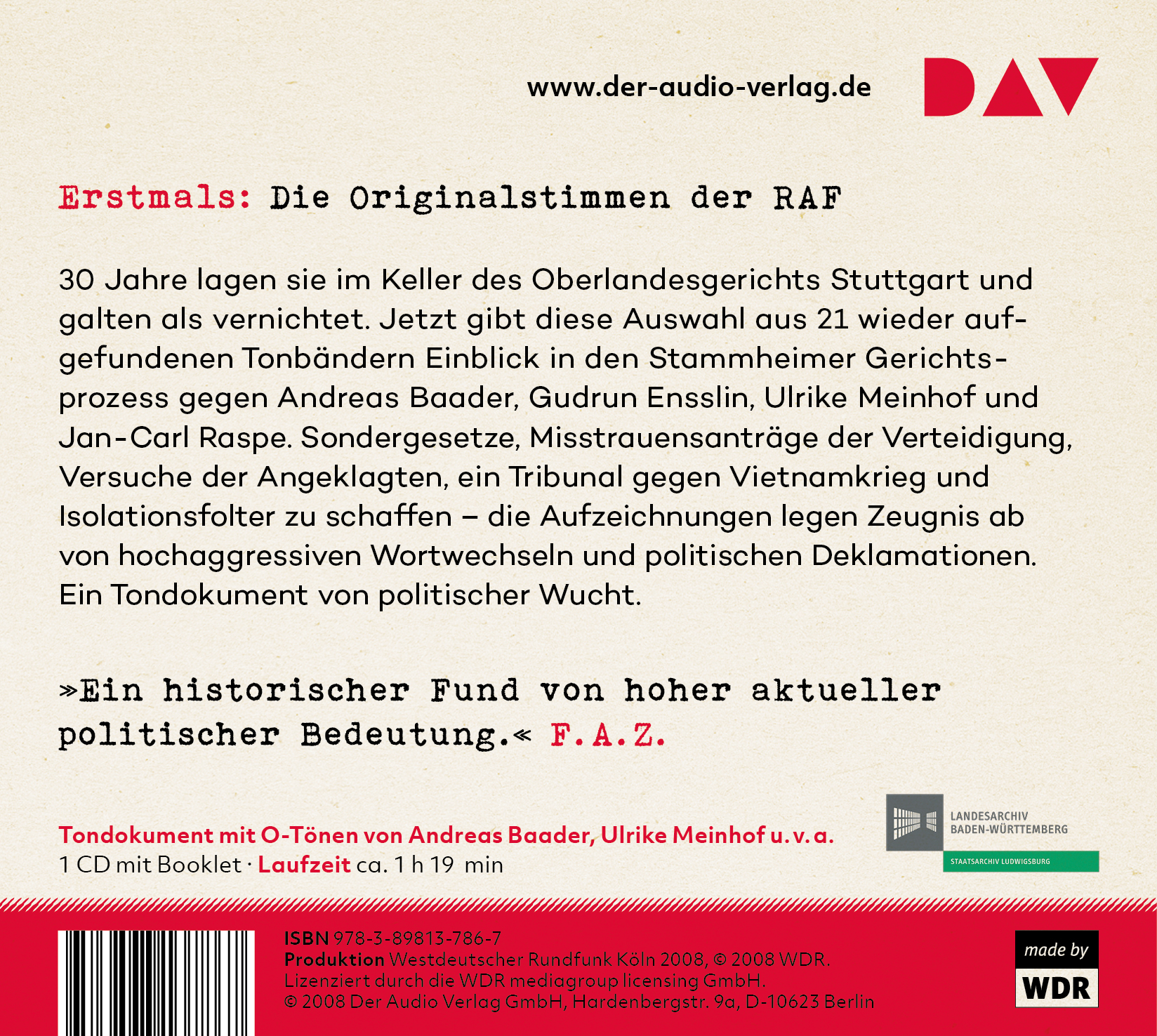 Erstveröffentlichung: Originalstimmen der RAF - 30 Jahre lagen sie im Staatsarchiv Ludwigsburg, jetzt gibt diese Auswahl aus 21 wieder aufgefundenen Tonbändern Einblick in den Stammheimer Gerichtsprozess gegen Andreas Baader, Gudrun Ensslin, Ulrike Meinhof und Jan-Carl Raspe. Sondergesetze, Misstrauensanträge der Verteidigung, Versuche der Angeklagten, ein Tribunal gegen den Vietnamkrieg und die Isolationsfolter zu schaffen - die Aufzeichnungen legen Zeugnis ab von hochaggressiven Wortwechseln und politischen Deklamationen. Ein Tondokument von politischer Wucht. Ausgezeichnet mit dem Deutschen Hörbuchpreis in der Kategorie "Beste Information"