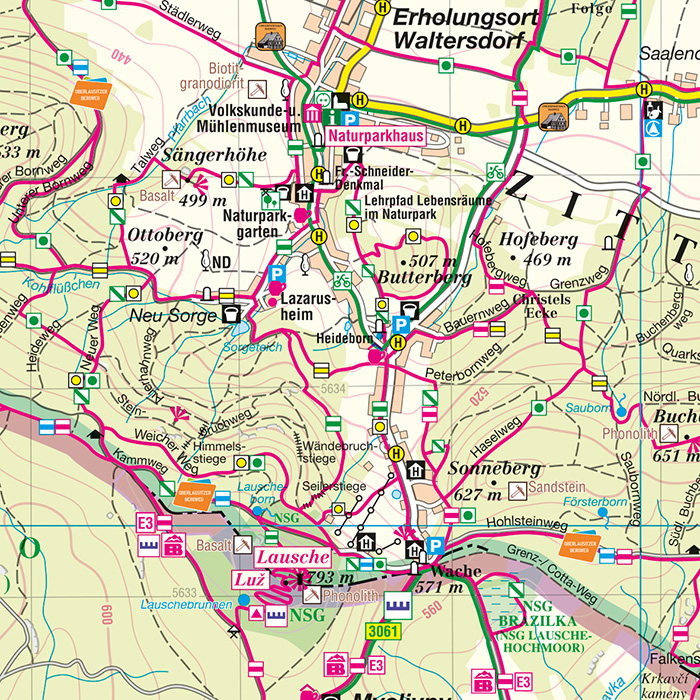 Beinhaltet alle markierten Wanderwege wie den Oberlausitzer Bergweg und Kammweg als auch Radwege mit deren Kennzeichnung.