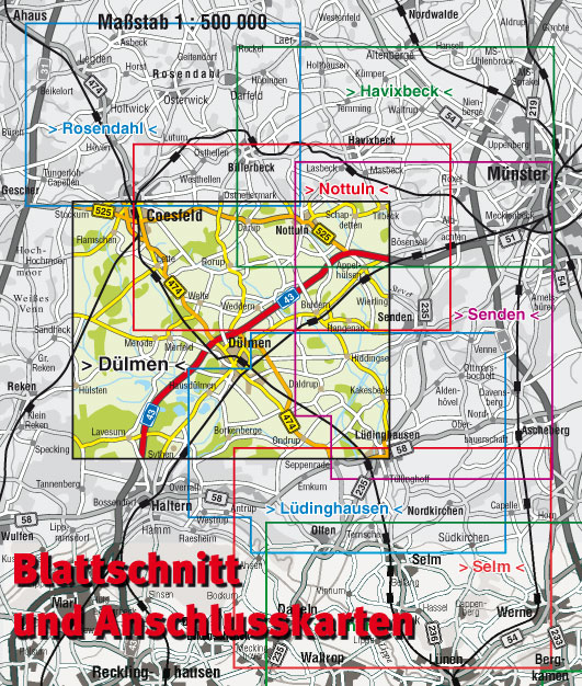 - Ortsausschnittvergrößerungen mit Straßennamensverzeichnis von Merfeld, Rorup, Buldern, Hiddingsel und Dülmen im Maßstab 1:15.000