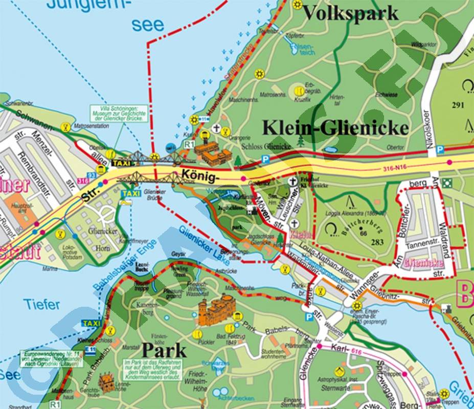 Mit Anlegestellen der Ausflugsschiffe, Aussichtspunkte, Badestellen, Sehenswürdigkeiten, Museen, öffentlicher Nahverkehr, Sport- und Spielplätze.