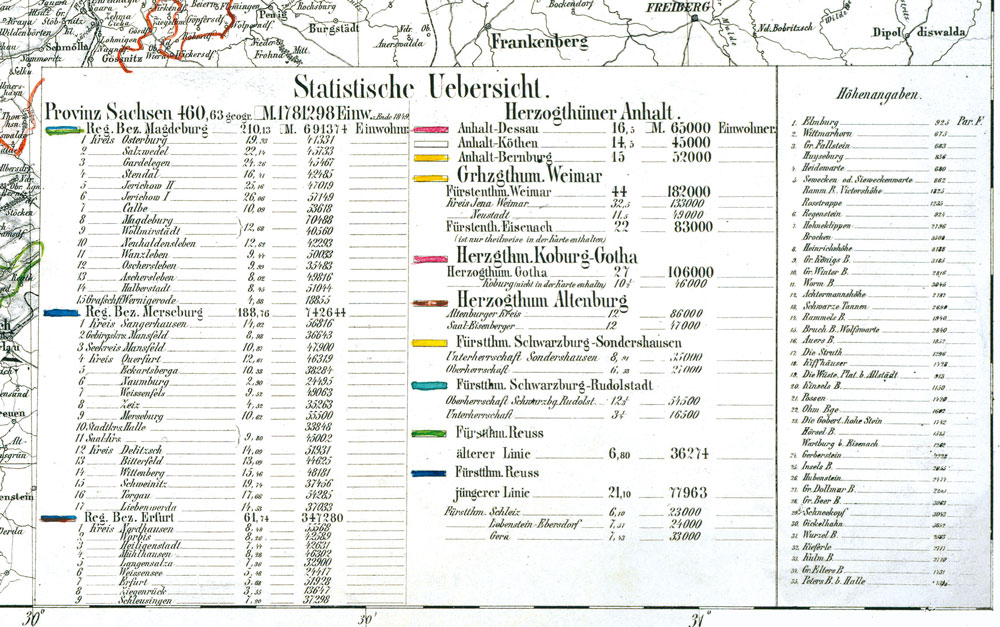Auf der Karte die Regierungsbezirke Magdeburg, Merseburg und Erfurt; das Herzogtum Anhalt, der Herzog. Sächsischen Länder Großherzogtum Weimar, die Herzogthümer Altenburg und Koburg-Gotha und die Fürstenthümer Schwarzburg und Reuss