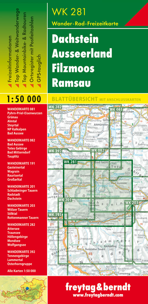 freytag & berndt Wanderkarten sind dank der detaillierten digitalen Kartographie und der genauen Maßstäbe ideale Begleiter beim Wandern, Bergsteigen und auf Skitouren. Die "WK 281 Dachstein - Ausseerland - Filzmoos - Ramsau, Wanderkarte 1:50.000" wird regelmäßig überarbeitet und enthält aktualisierte Informationen zu Wanderwegen, Rad- und Mountainbikestrecken, Hütten, Naturdenkmälern, kulturellen Sehenswürdigkeiten und Freizeiteinrichtungen.
