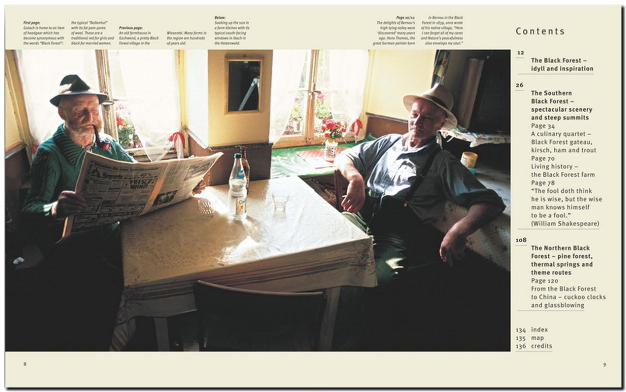 Über 210 Bilder zeigen den Schwarzwald in all seinen Facetten. Vier Specials berichten über die traditionelle Handwerkskunst von der Schwarzwalduhr bis zum Glasbläser, die kulinarischen Köstlichkeiten, die alemannische Fasnet und das charakteristische Schwarzwaldhaus.