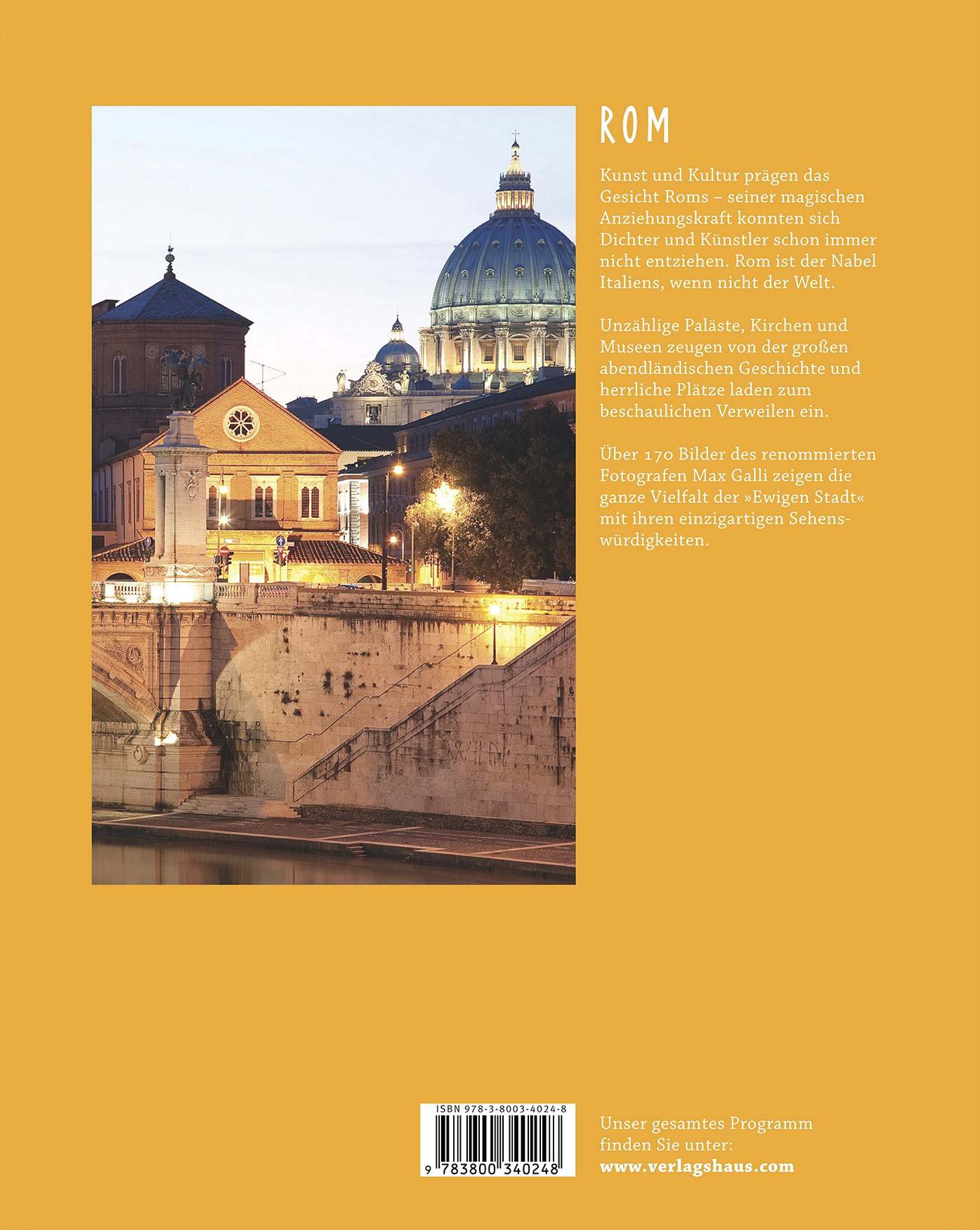 | Schlagworte | Bildband • Caffè Greco • Campo de'Fiori • Ewige Stadt • Fontana di Trevi • Forum Romanum • Hardcover, Softcover / Reisen/Bildbände/Europa • Imperium Romanum • Italien • Kapitol • Kapitolinisches Museum • Kolosseum • Konservatorenpalast • Marsfeld • Pantheon • Papst • Petersdom • Petersplatz • piazza del popolo • Piazza Navona • Reisebildband • Rom • Rom (Stadt); Bildband • S. Agnese • Theater des Marcellus • Thermenmuseum • Tiber • Trastevere • Vatikan • Vatikanische Museen • Villa d'Este • Ville Medici |