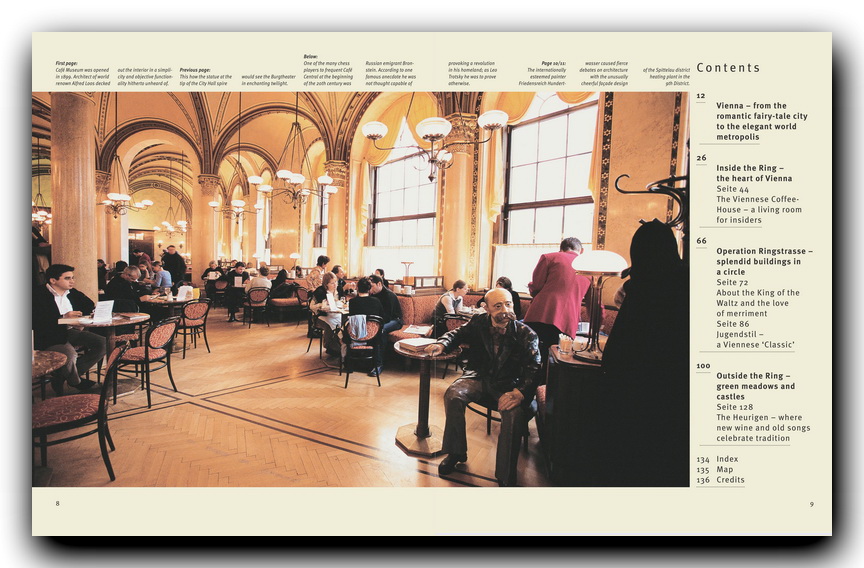 Über 180 Bilder zeigen Wien in seiner ganzen Vielfalt und vier Specials berichten über das Wohnzimmer der Wiener: das Kaffeehaus, den berühmten Wiener Walzer, die Pracht des Jugendstils und die Institution Heurigen.