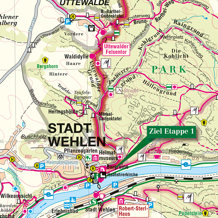 Durch die Darstellung der naturkundlichen, geologischen und historischen Informationen wird der Kartennutzer auf die großen und kleinen Sehenswürdigkeiten rechts und links des Weges aufmerksam gemacht.