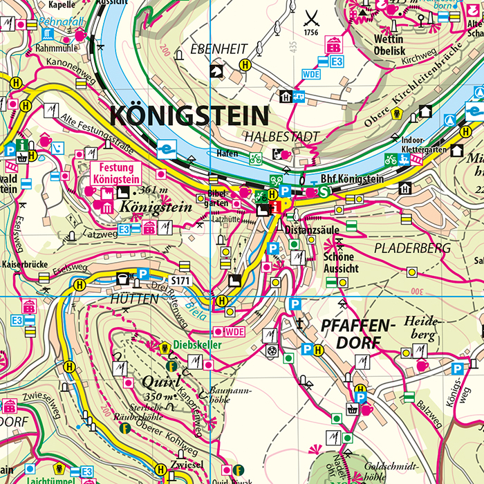 Beinhaltet alle markierten Wanderwege u.a. den Malerweg sowie den Forststeig als auch Radwege wie den Elberadweg mit deren Kennzeichnung.